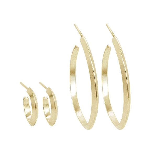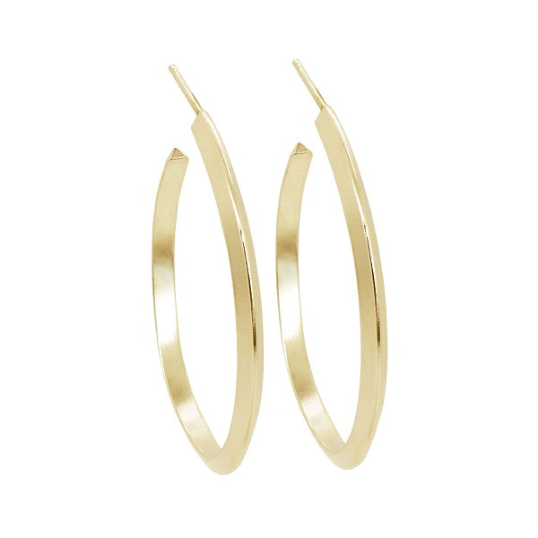 Hand formed triangle shaped hoop earrings with front facing edge. Finished with ear posts & come with butterfly ear nuts.