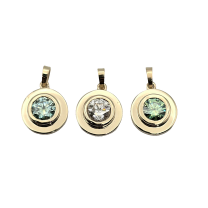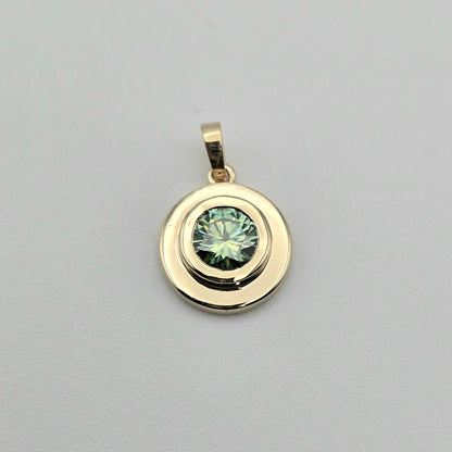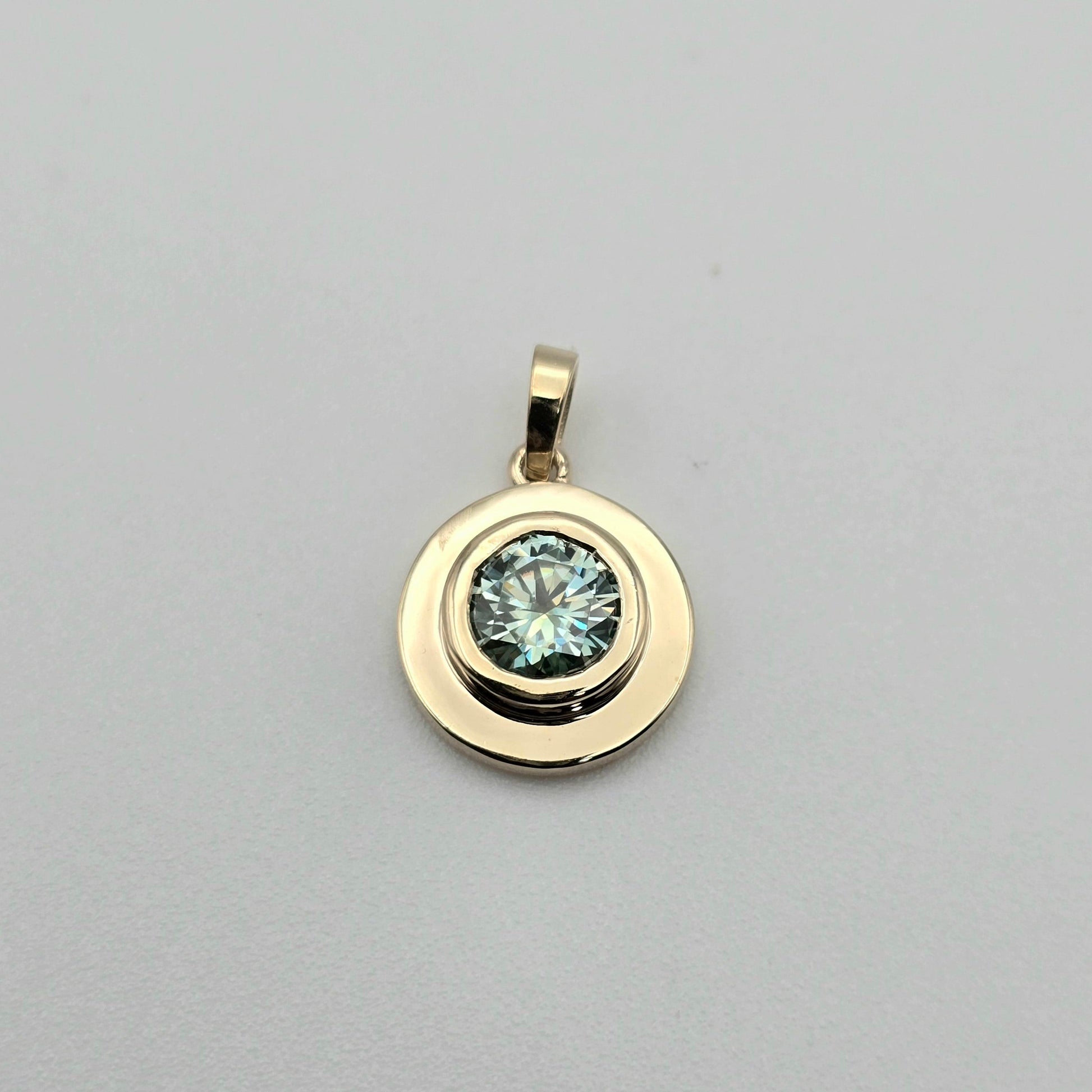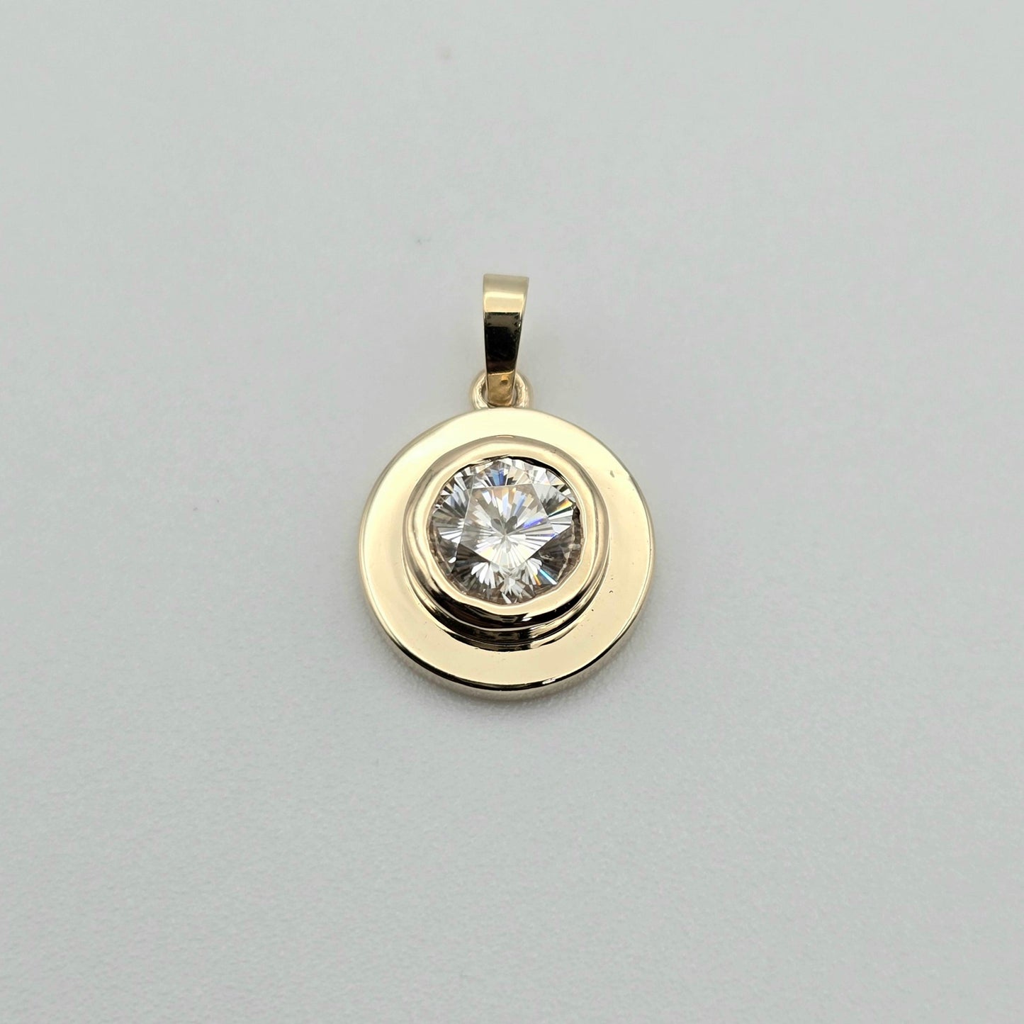 Lab created moissanites set in 14k yellow gold. Stone has a heavy bezel setting on a surface that fans out. Stone size is 6.5mm. Pendant is smooth & polished to a high shine glossy finish.