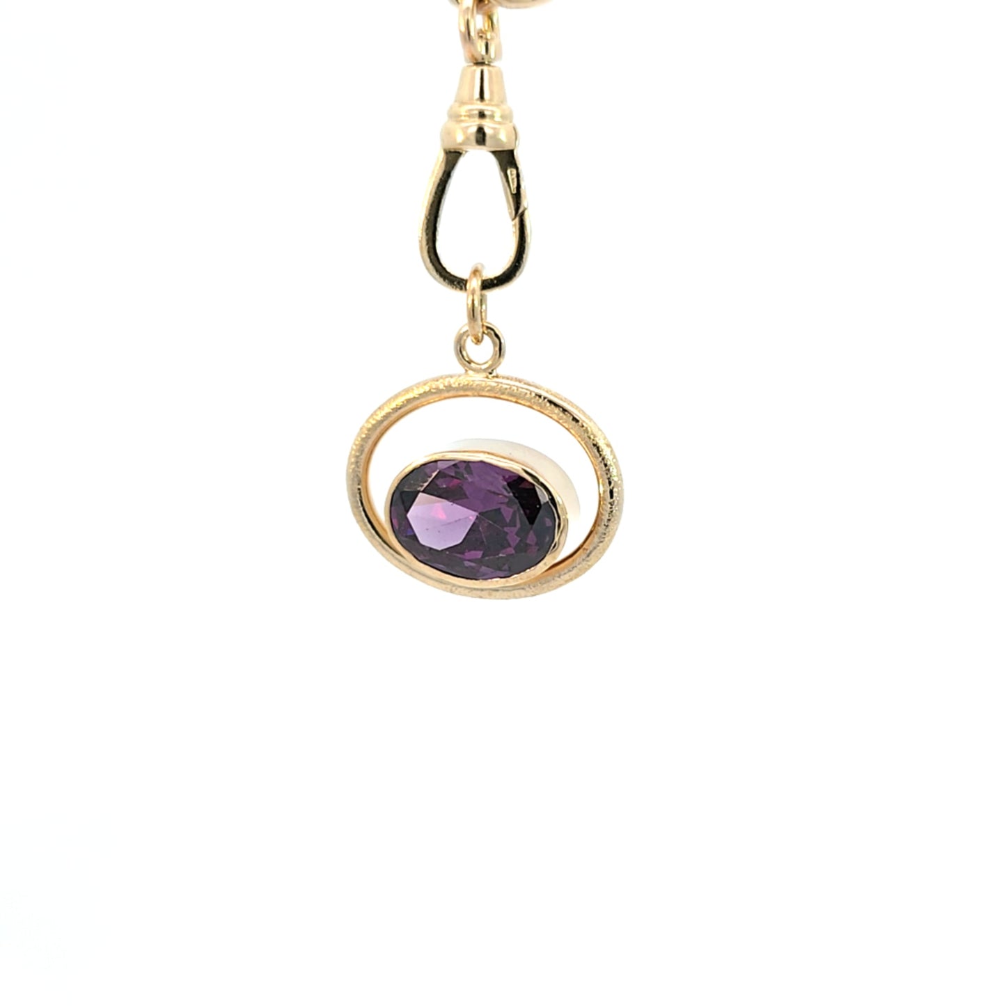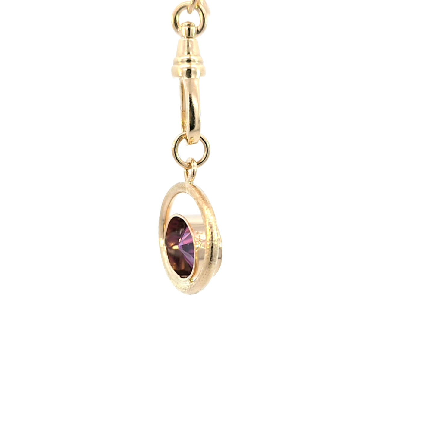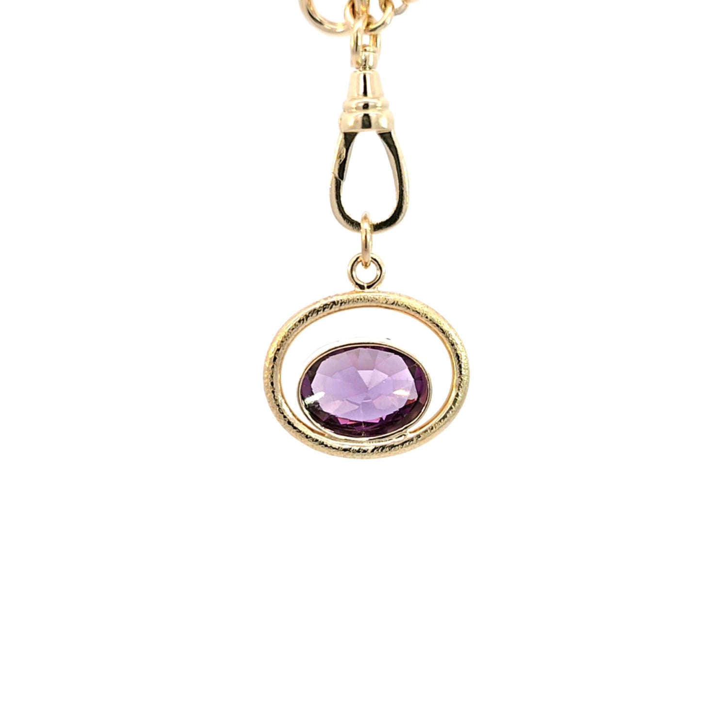 Natural amethyst of Nigerian origin set in 14k yellow gold. Bezel set stone on the edge of a heavy wire frame. Frame is oval shaped and textured. Pendant is hand fabricated.