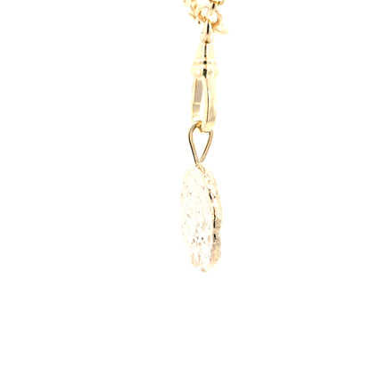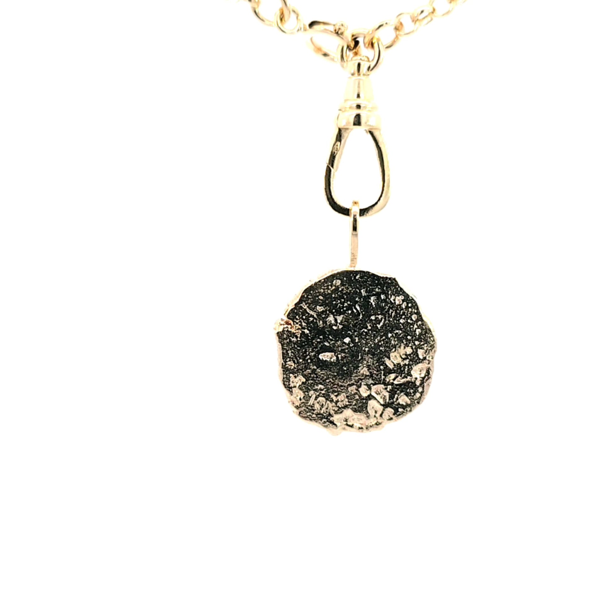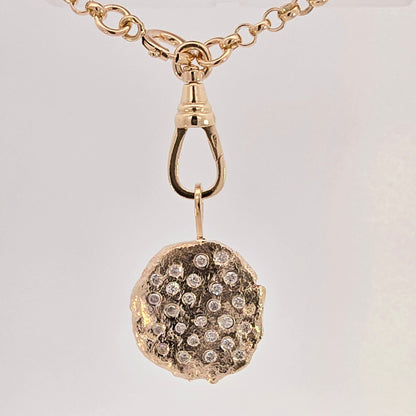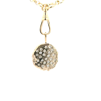 Recycled 10k yellow gold melted & hammer flattened into an organic round-ish shape then set with 25x 1.75mm diamonds. All diamonds are natural earth mined & SI1-2 clarity. Fixed bail.