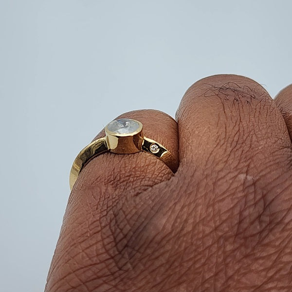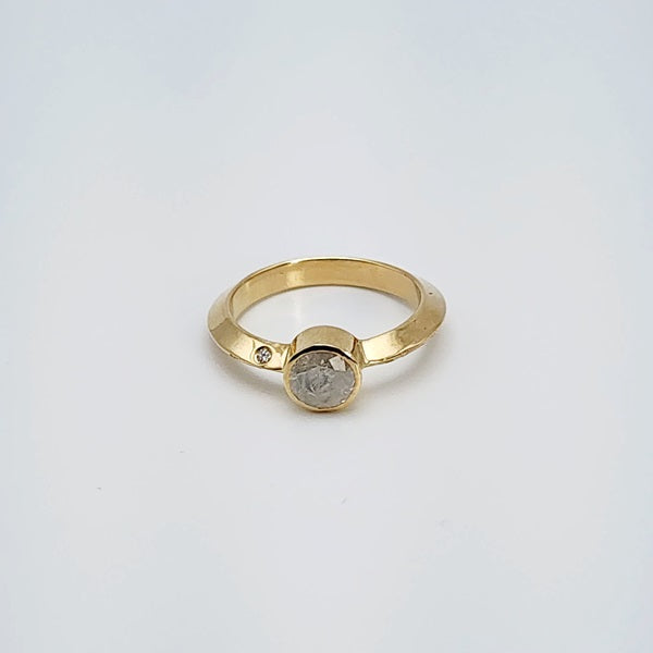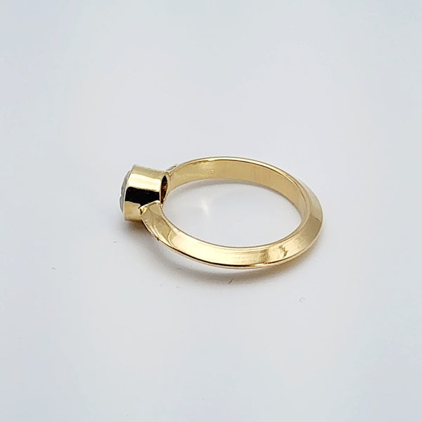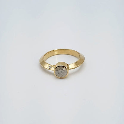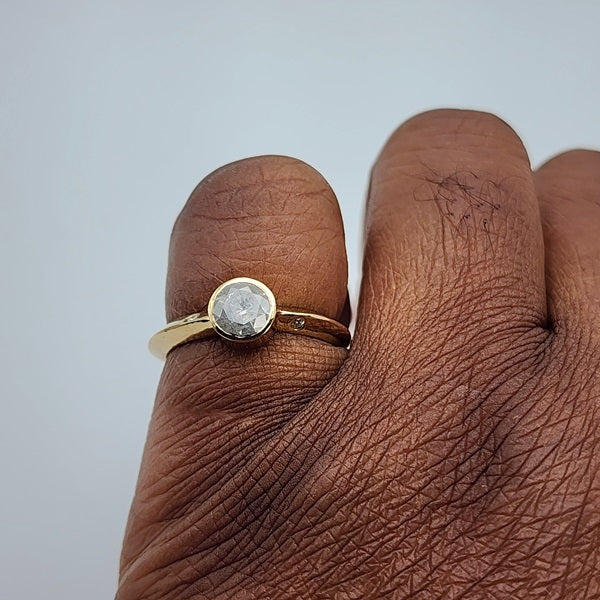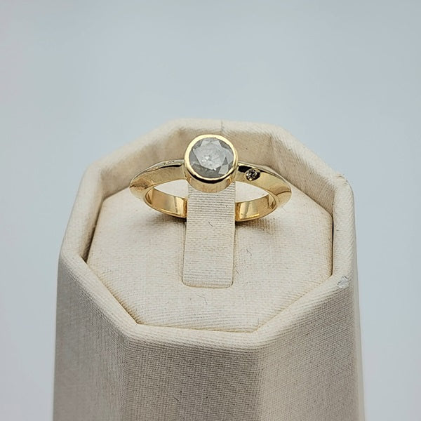 Natural grey-ish white diamond with salt & pepper inclusions bezel set in 14k yellow gold on a thick knife edge band. Band is 3mm wide by 2.5mm thick & is flush set with 2x 2mm VS clarity white diamonds, 1 on either side.