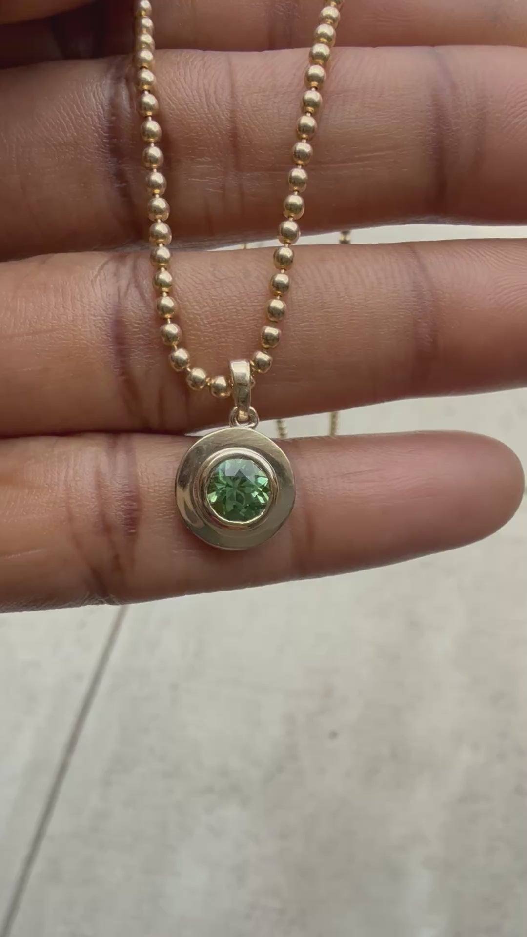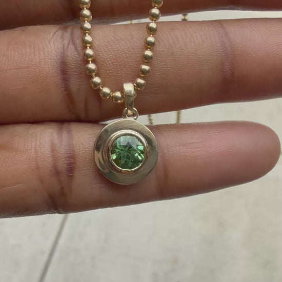 Natural green tourmaline set in 14k yellow gold. Stone is bezel set on a surface that fans out. Stone is 0.97ct & sized 6mm. Pendant is smooth & polished to a high shine glossy finish.