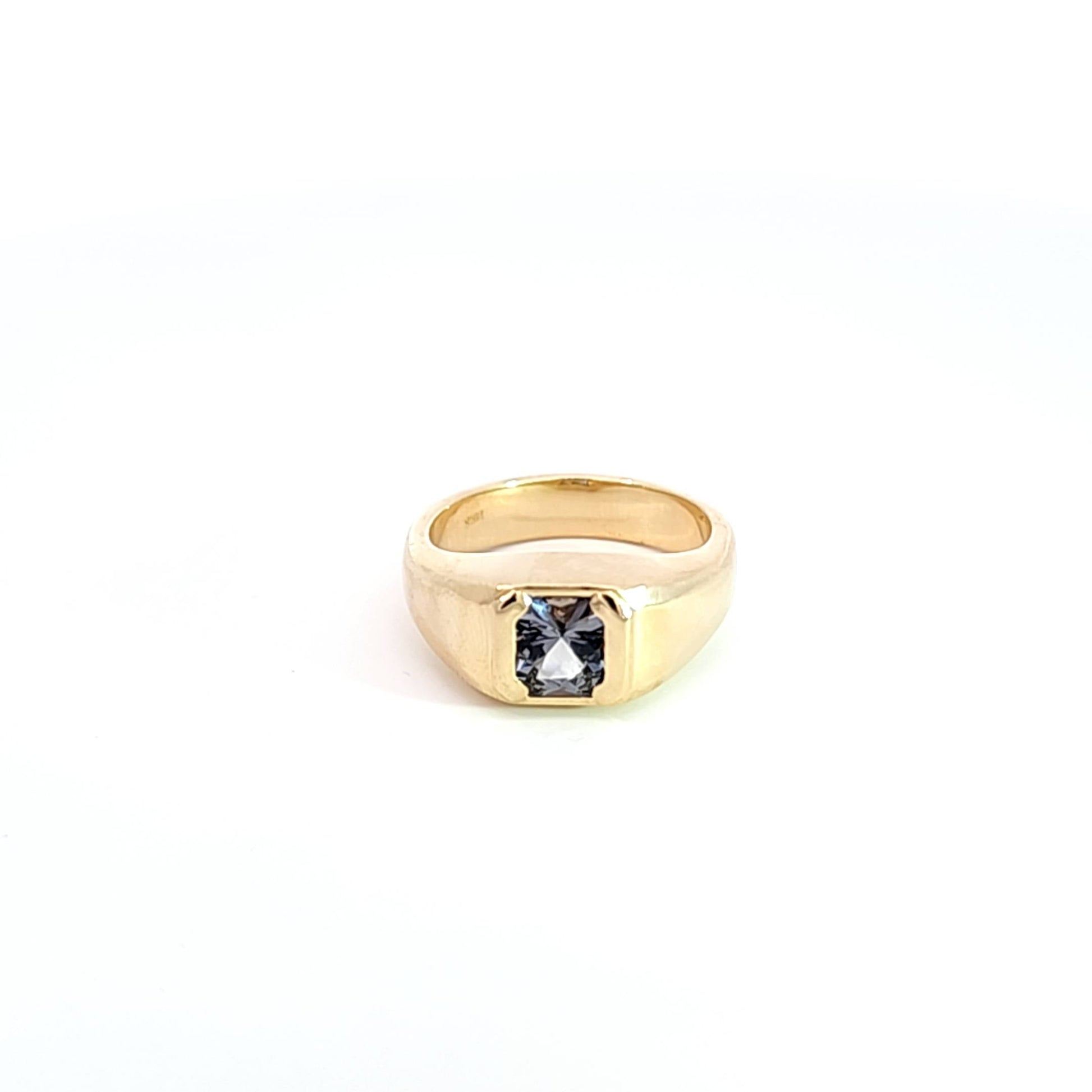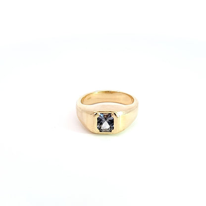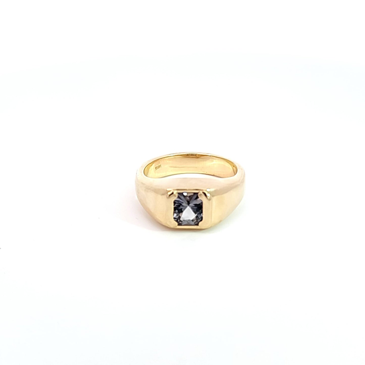 Signet ring with natural purple spinel. Partial bezel setting, stone is a 7mm asscher cut. Solid 14k yellow gold slightly hollowed out on the back underneath the stone.
