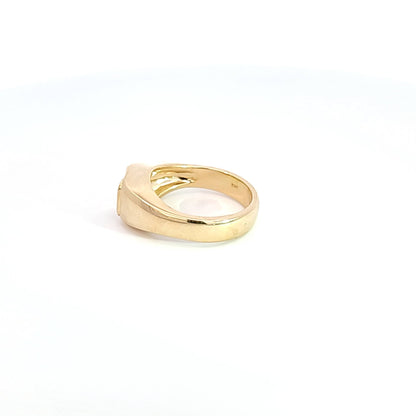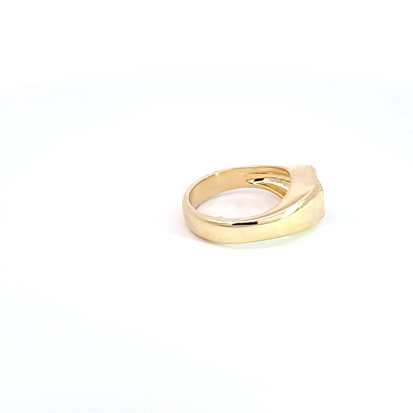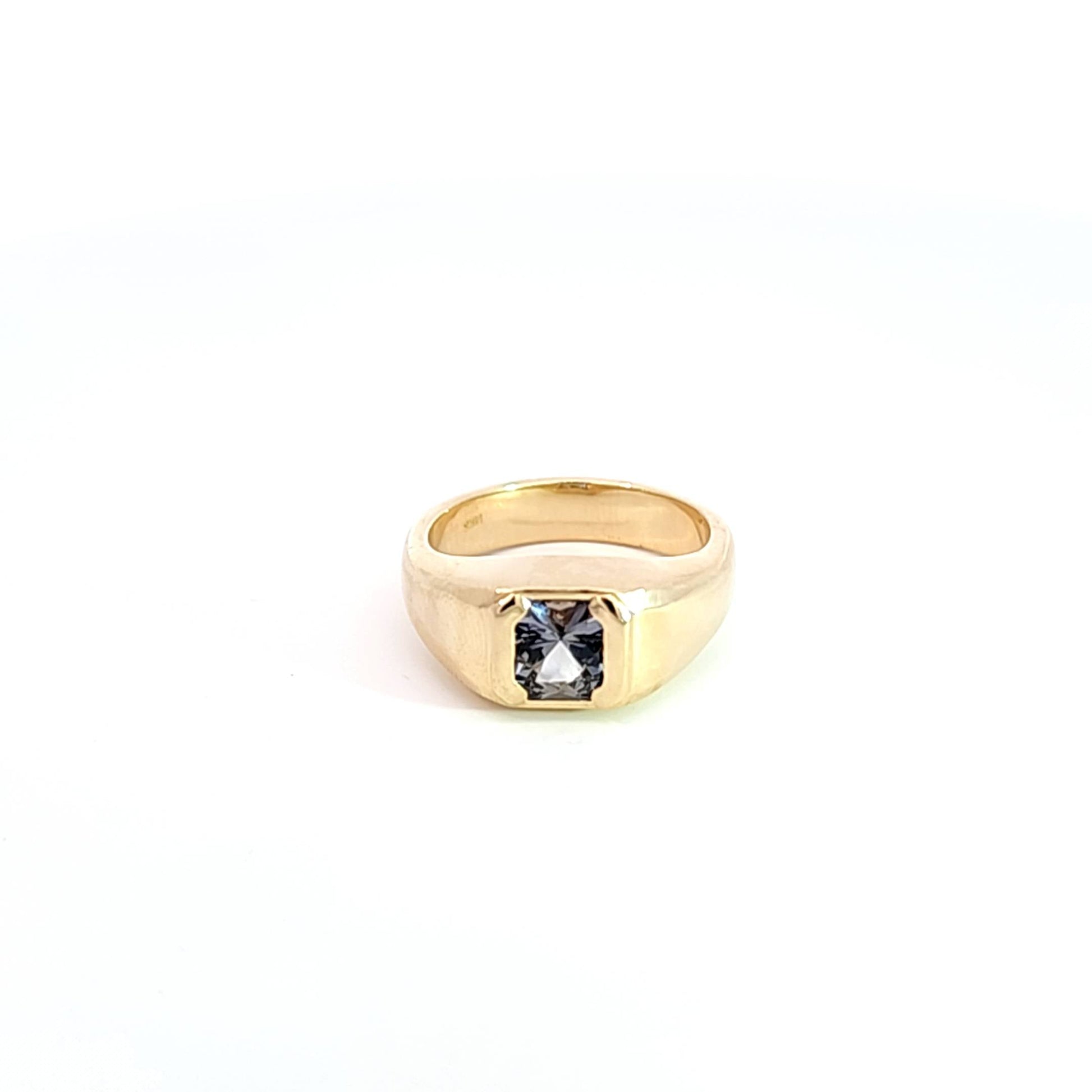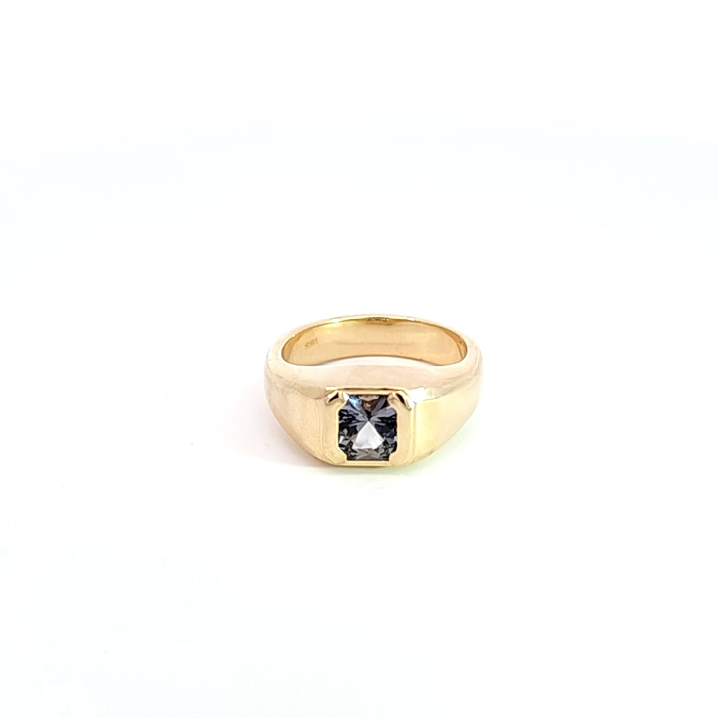 Signet ring with natural purple spinel. Partial bezel setting, stone is a 7mm asscher cut. Solid 14k yellow gold slightly hollowed out on the back underneath the stone.