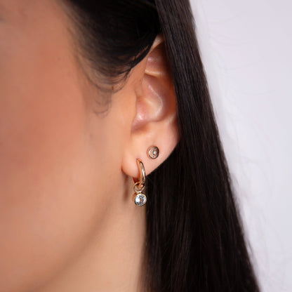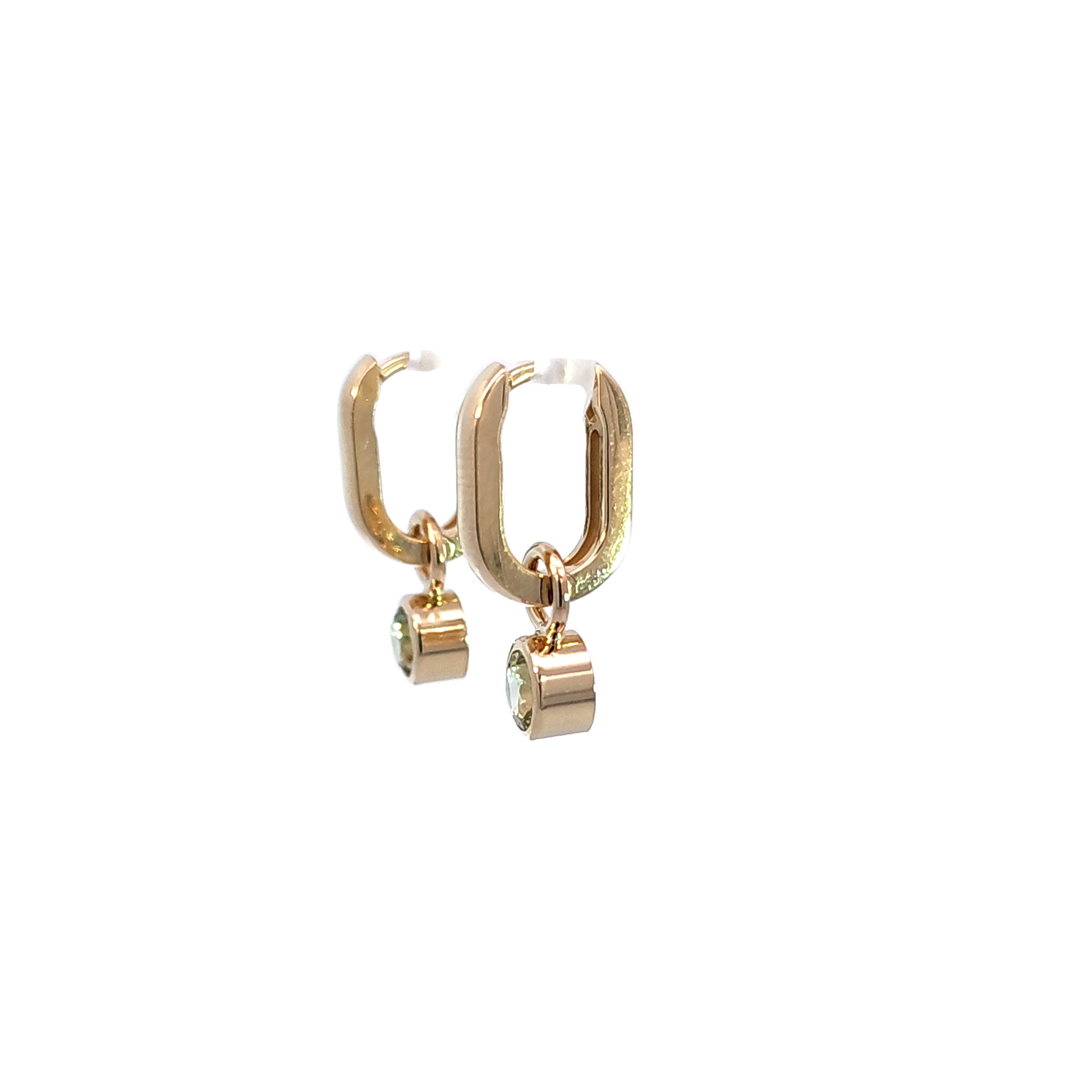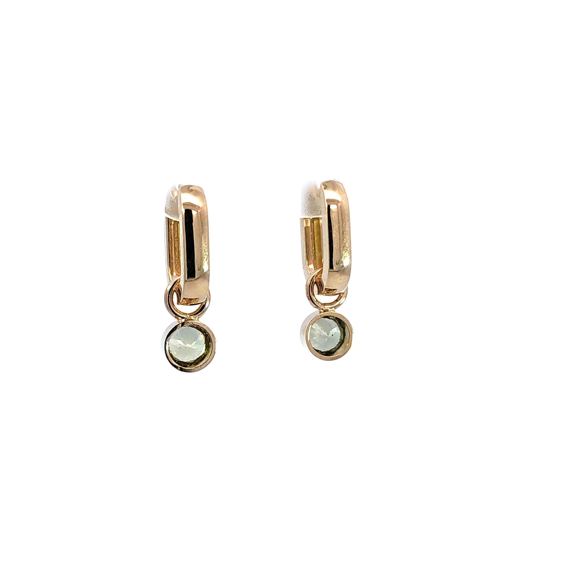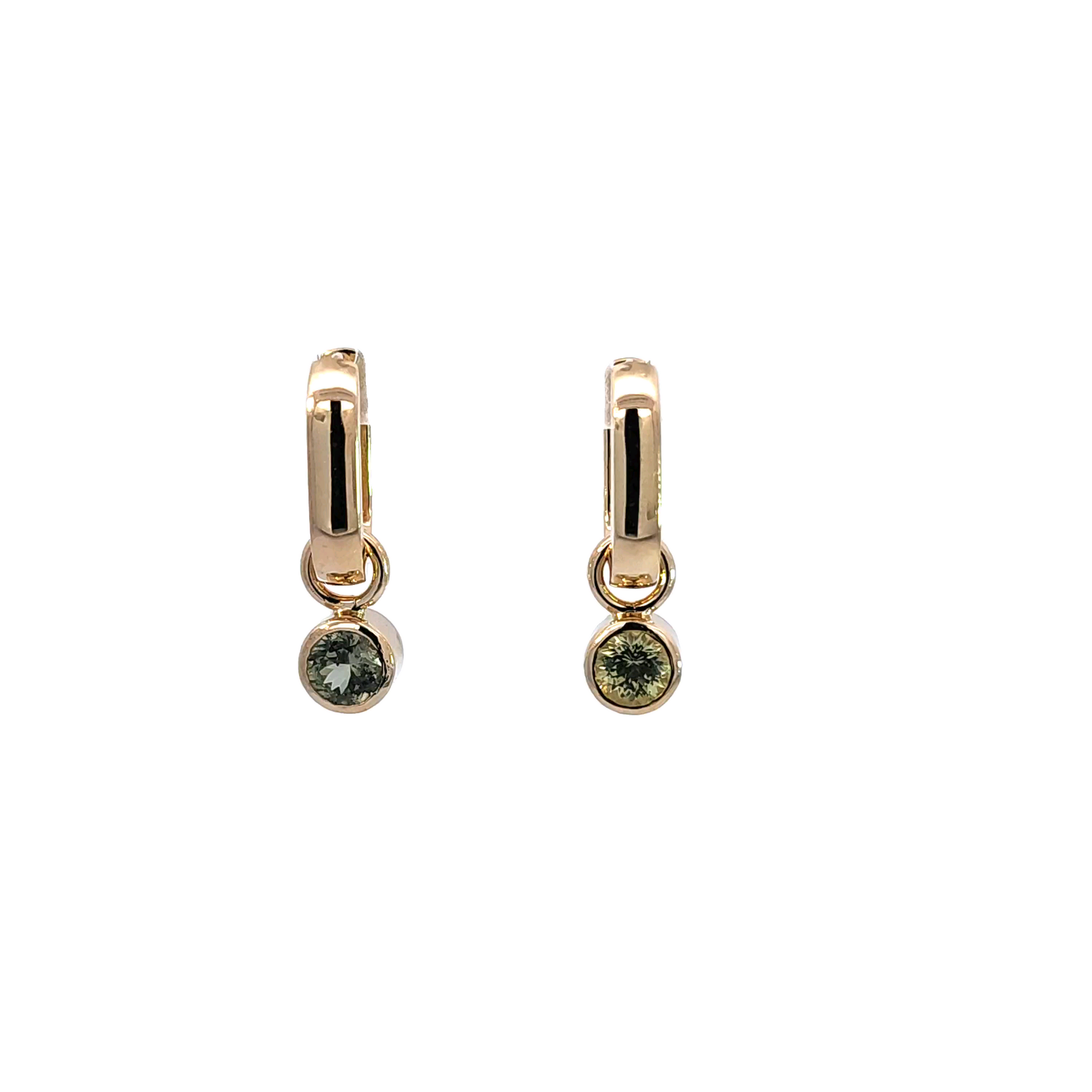 Natural light green Montana sapphires bezel set in 14k yellow gold. Step bezel setting with open back to let light through. Loops have an inner opening of 3.3mm & are shown here with a pair of hoops that are 2.9mm thick. This listing is for a pair of charms only.
