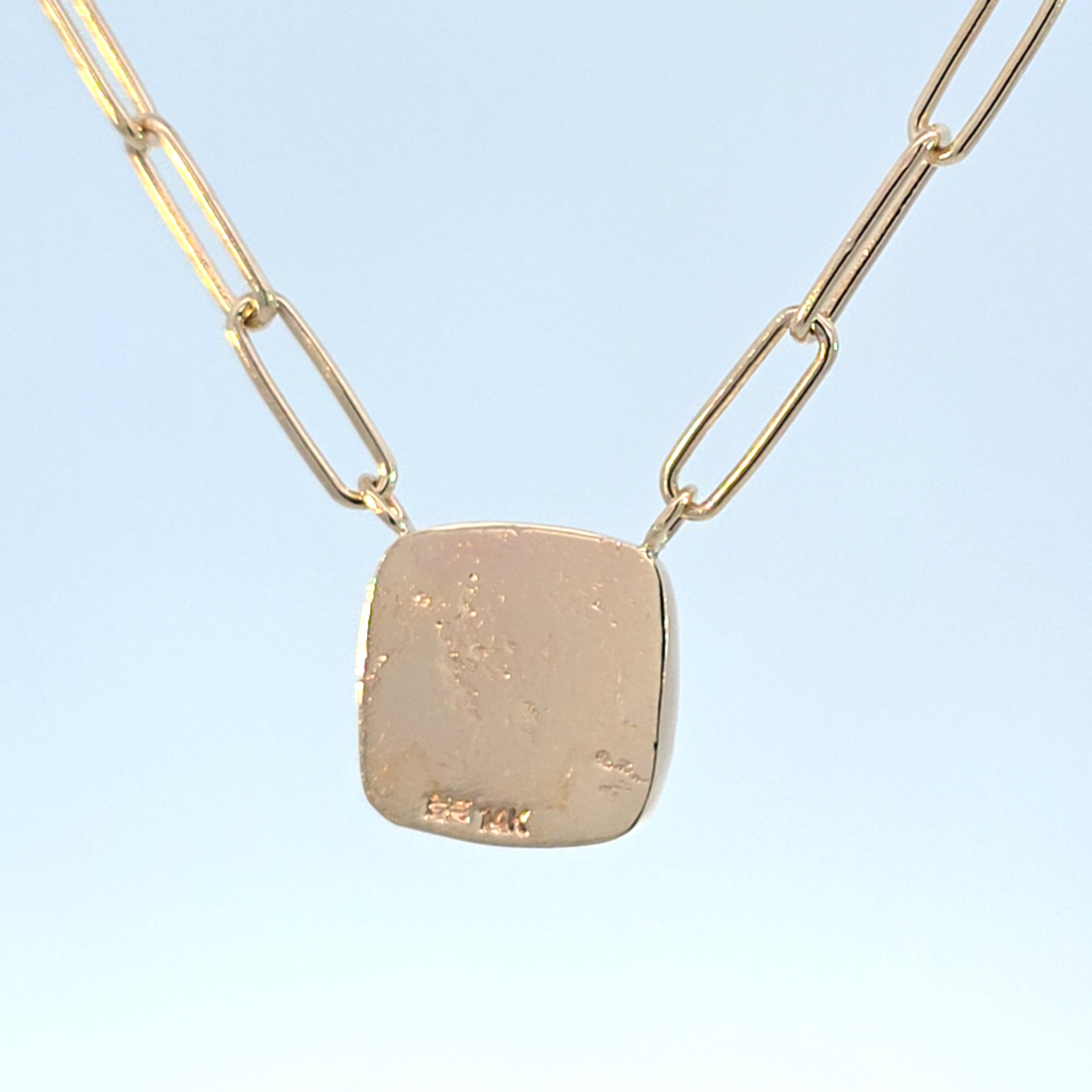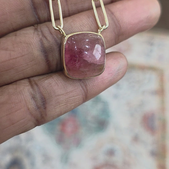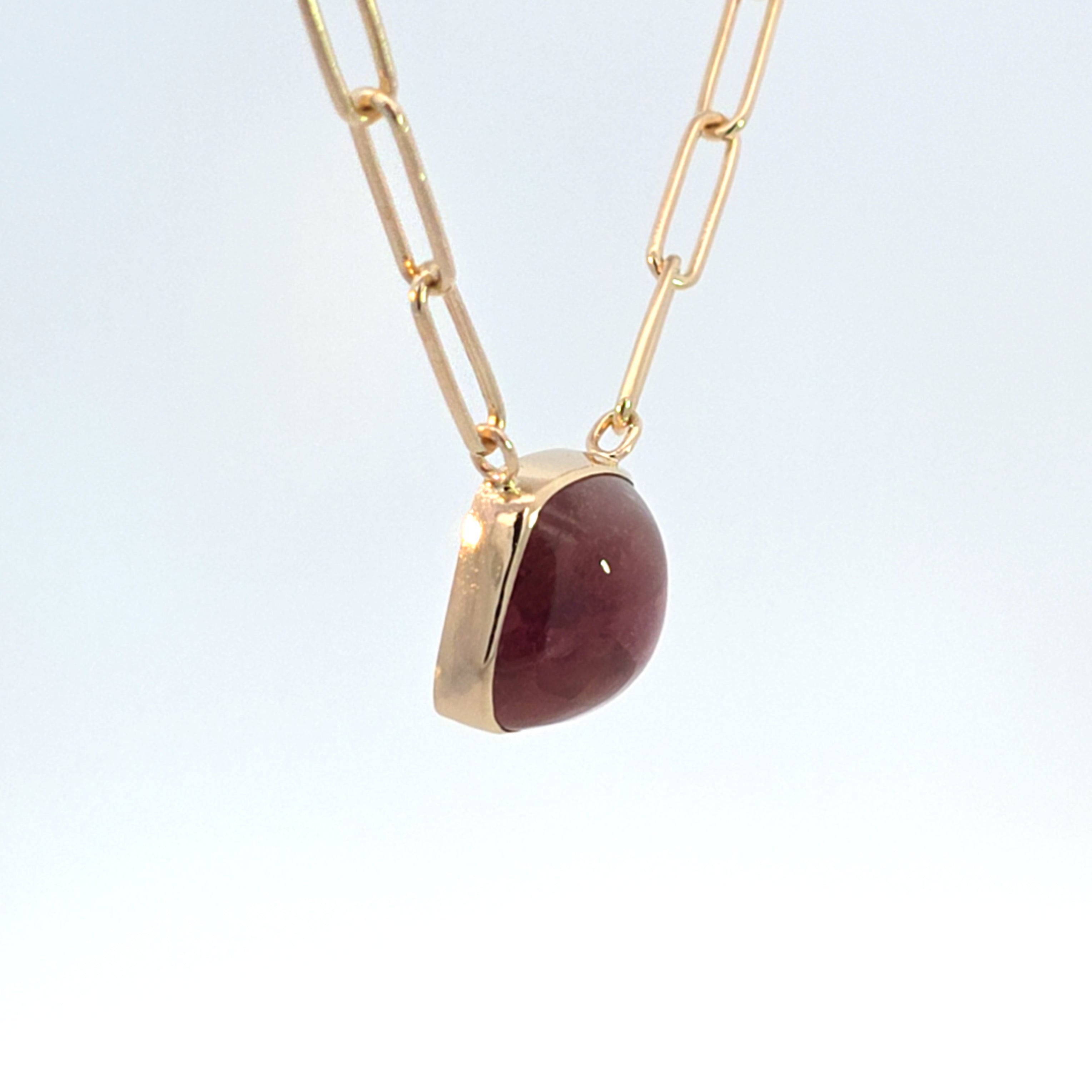 Natural pink tourmaline cabochon cut stone bezel set in 14k yellow gold. Finished with a handmade paperclip chain. Elongated push clasp to create a seamless look. Stone is set with a fully closed back.