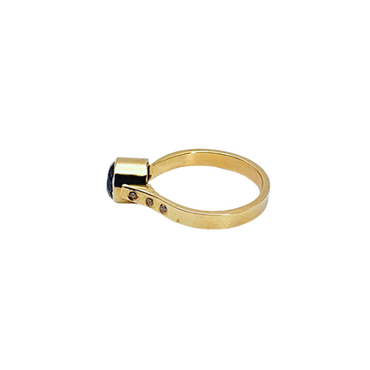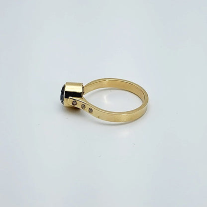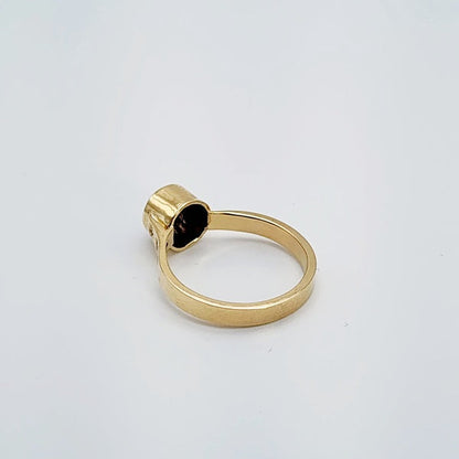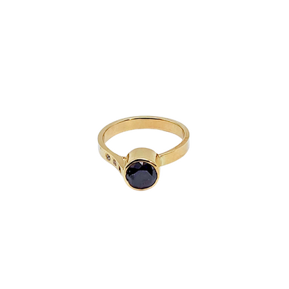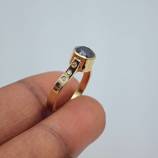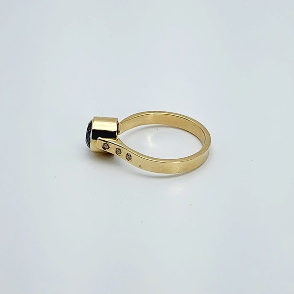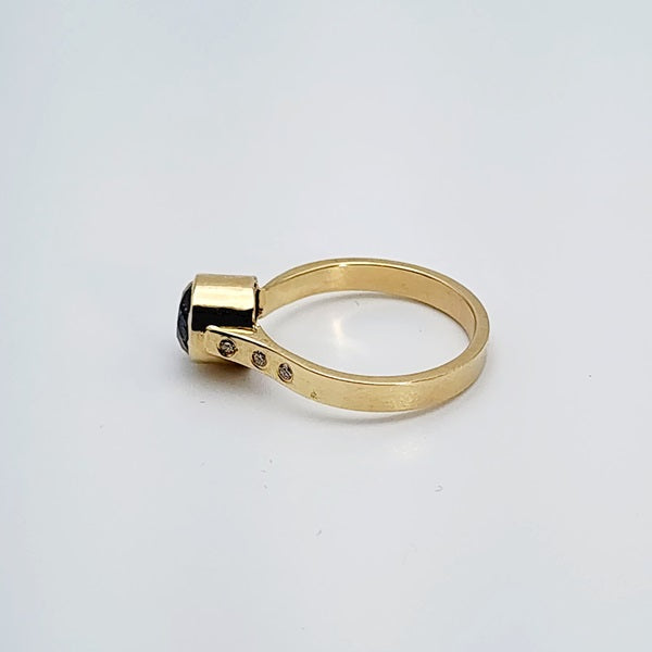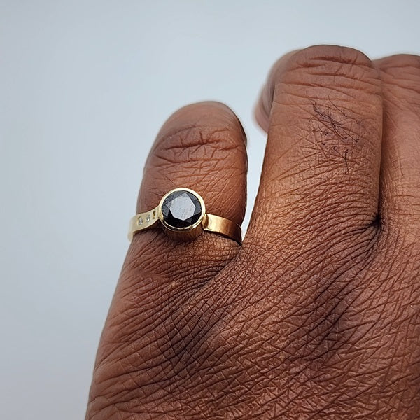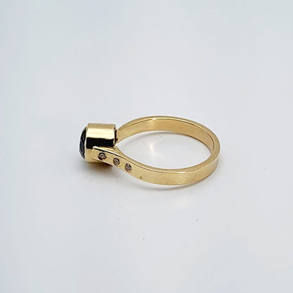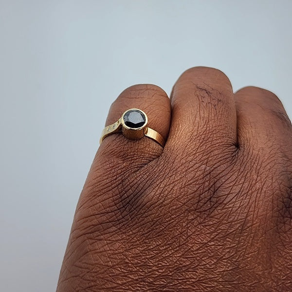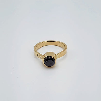 Color treated natural black diamond bezel set in 14k yellow gold. Flat band with a raised side flush set with 3x 1.5mm VS clarity white diamonds.