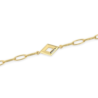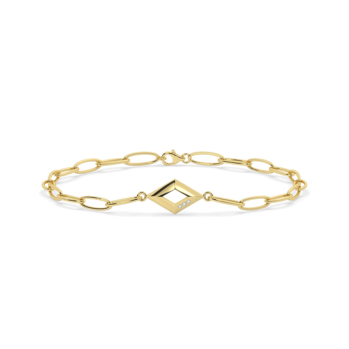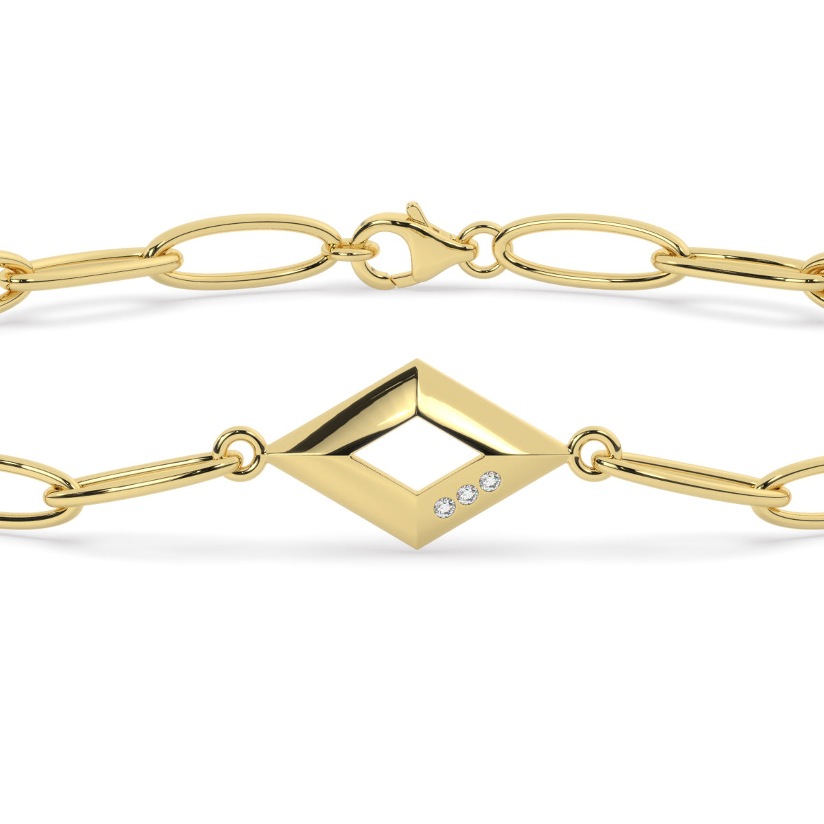 3D shaped diamond connector set with 3x 1mm natural white diamonds linked to a thick paper clip chain. Bracelet is all solid 14k gold with no hollow parts. Both connector & chain are solid. Chain width is 3.3mm with individual link length of 8mm. Connector is 20mm long by 10mm wide, Bracelet is finished with a trigger lobster clasp. All links are soldered & welded shut.