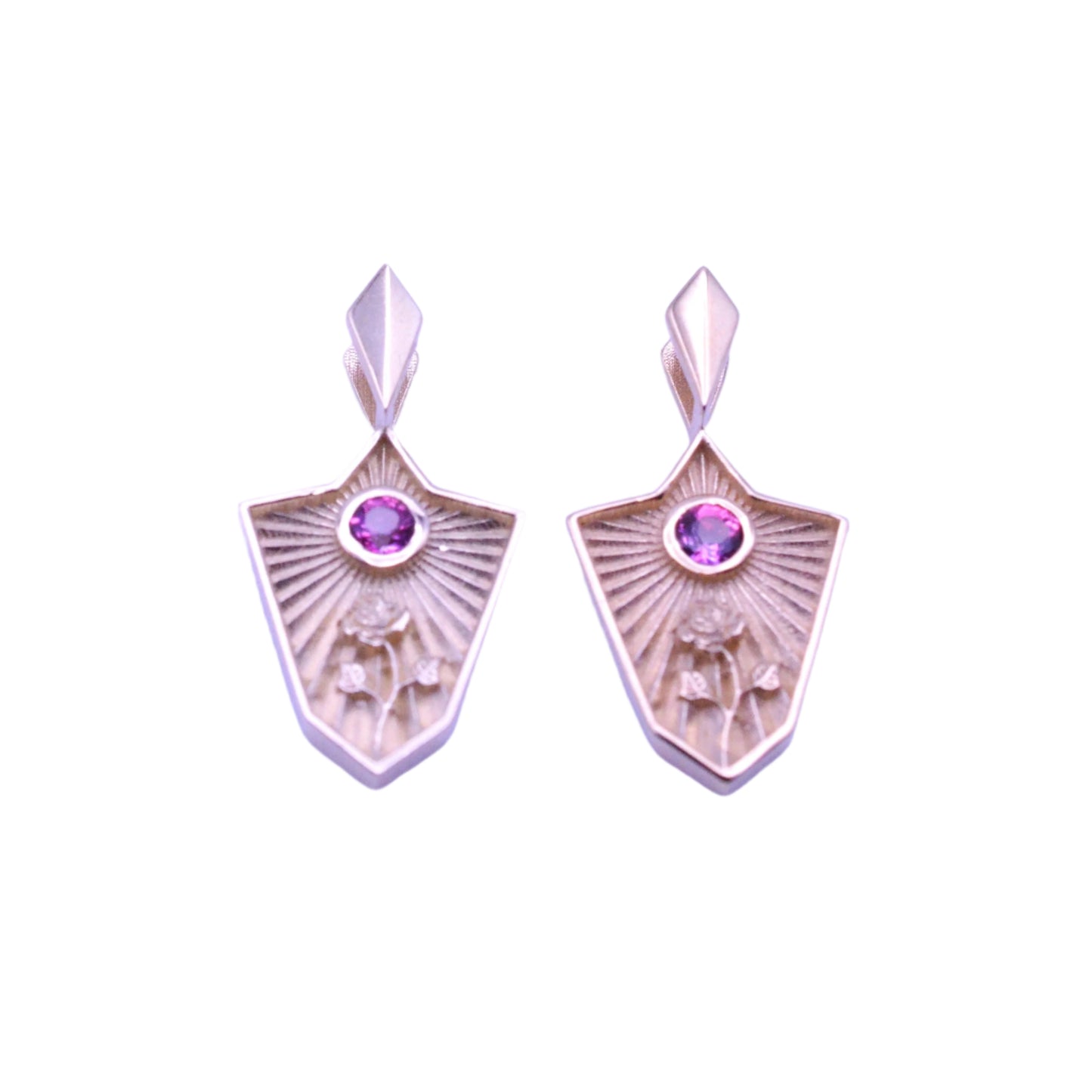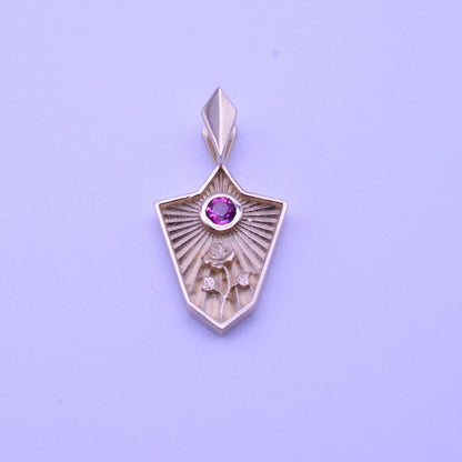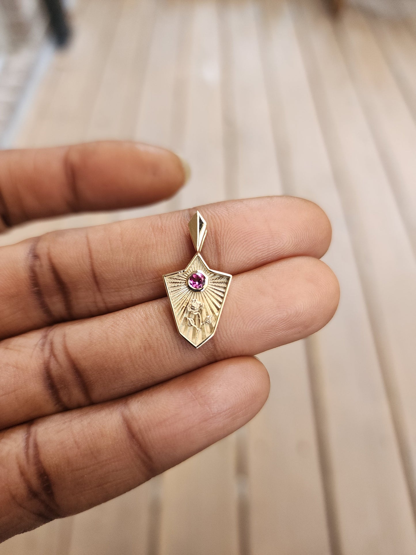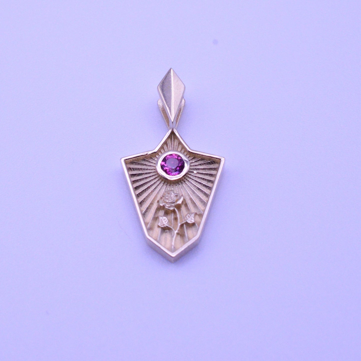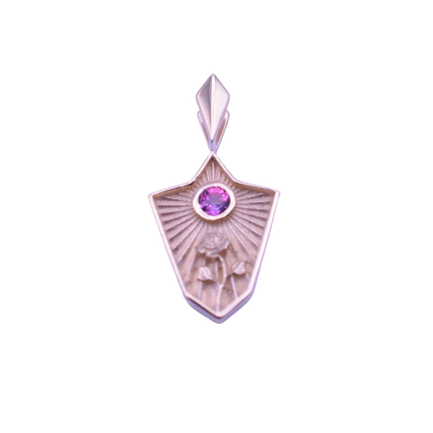 A shield for her. A talisman designed & made for us by us. A shield for protection. A rose for beauty that can sometimes be painful. A pink stone for femininity. A reminder to lean into your feminine energy always.