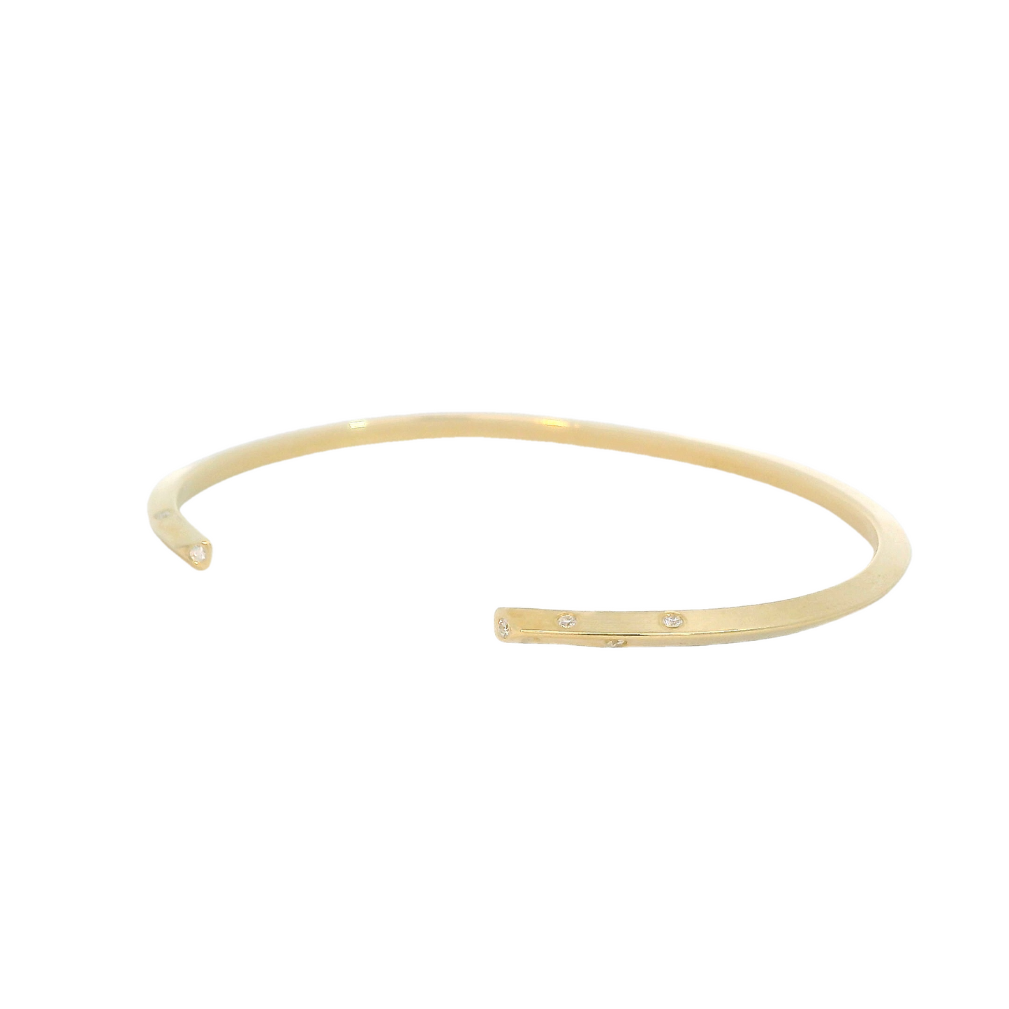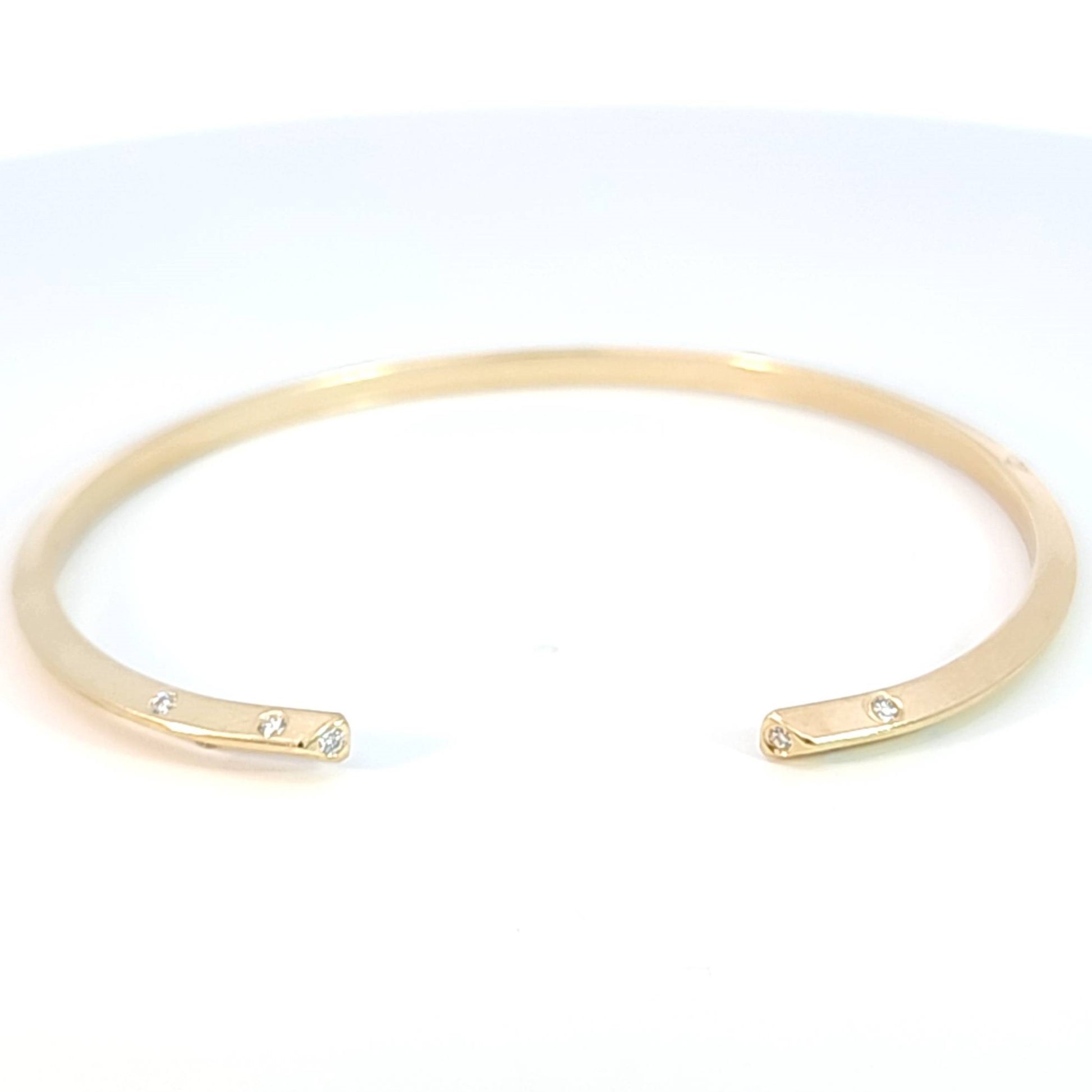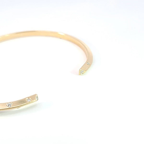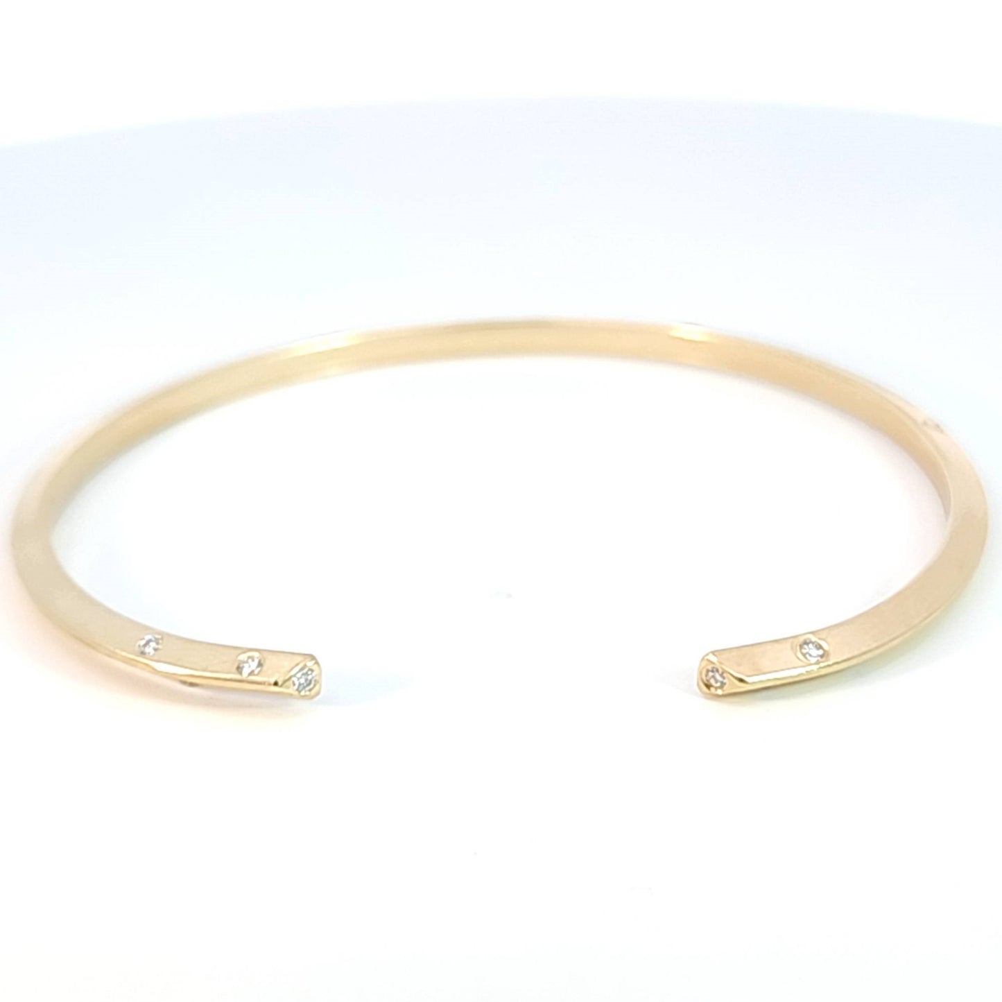 Heavy solid 14k yellow gold cuff bracelet with a knife edge. Cuff is set with a total of 8 1.5mm VS G color white diamonds. Diamonds are set on the edge & sides. Bracelet is 3mm wide by 2.5mm thick & adjustable.