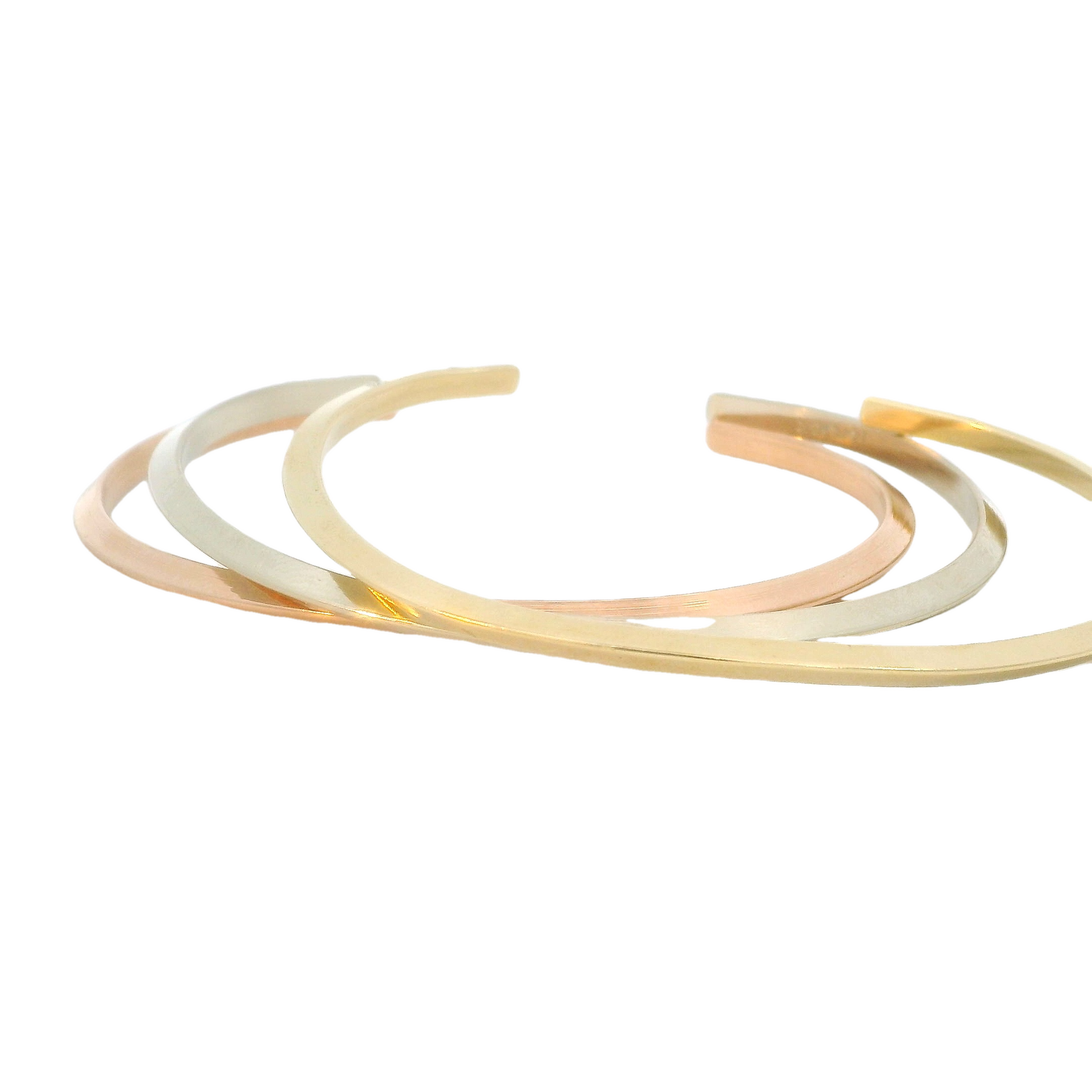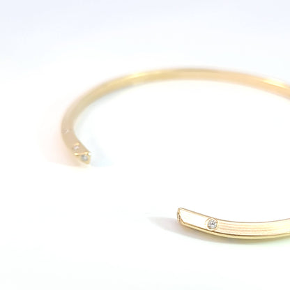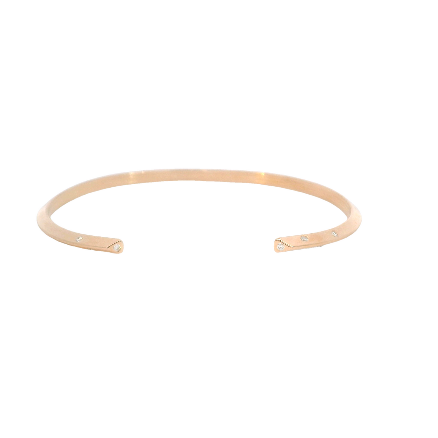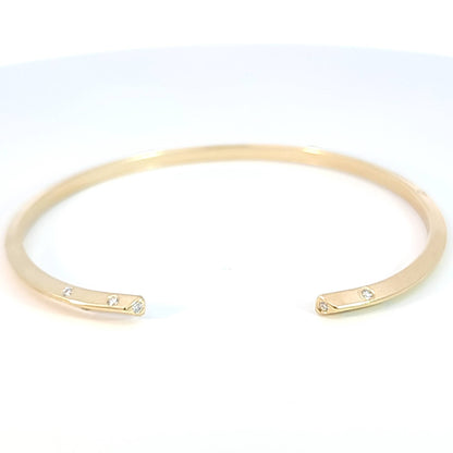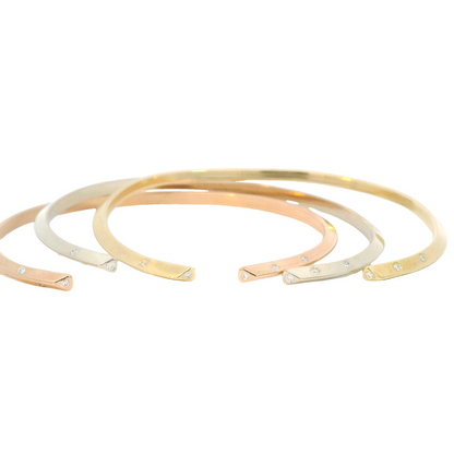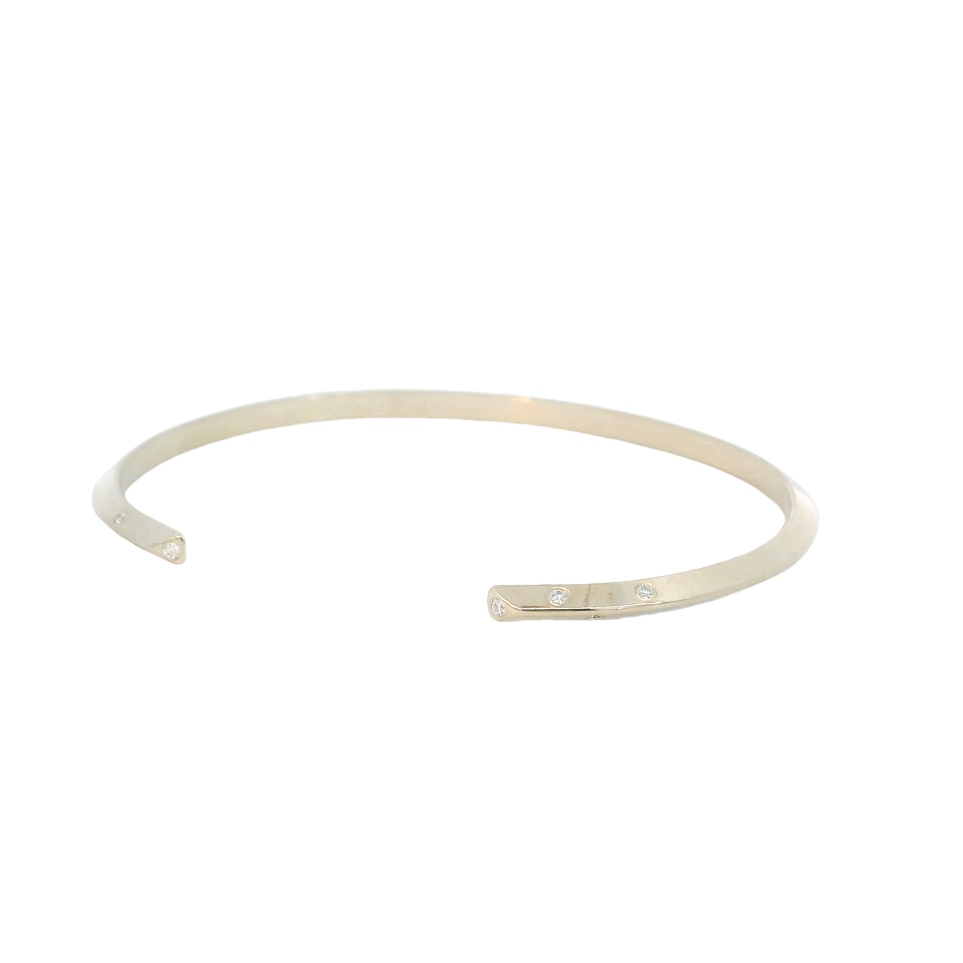 Heavy solid 14k yellow gold cuff bracelet with a knife edge. Cuff is set with a total of 8 1.5mm VS G color white diamonds. Diamonds are set on the edge & sides. Bracelet is 3mm wide by 2.5mm thick & adjustable.