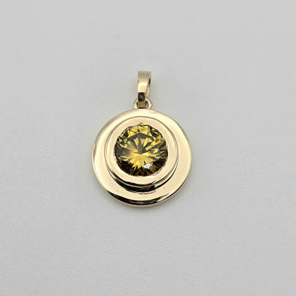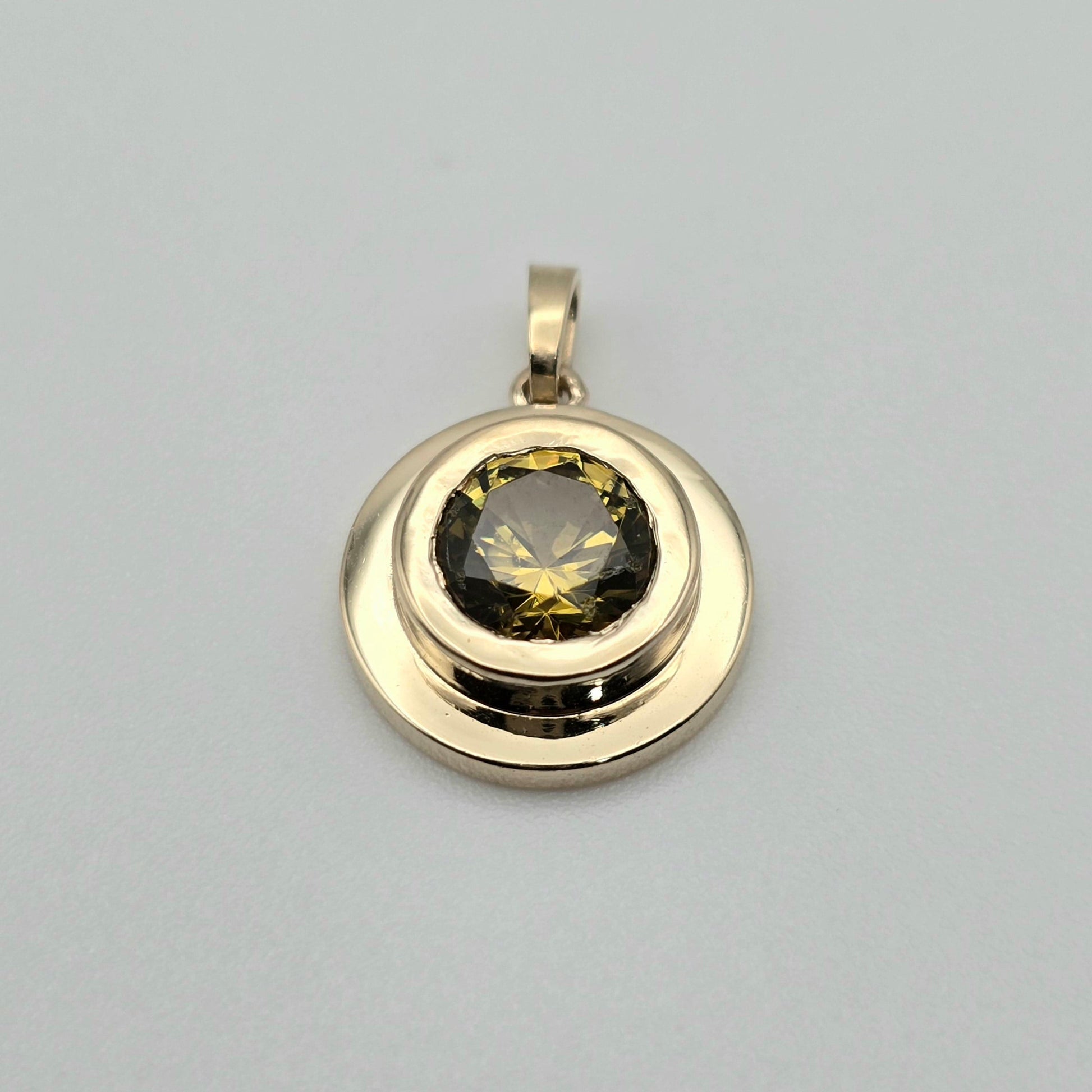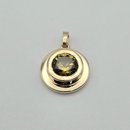 Green garnet set in 14k yellow gold. Stone is bezel set on a surface that fans out. Stone is 2.14ct & sized 8mm. Pendant is smooth & polished to a high shine glossy finish.