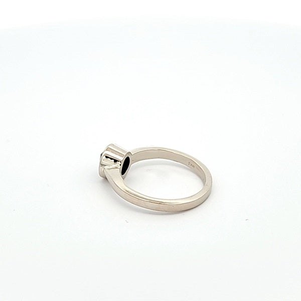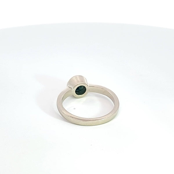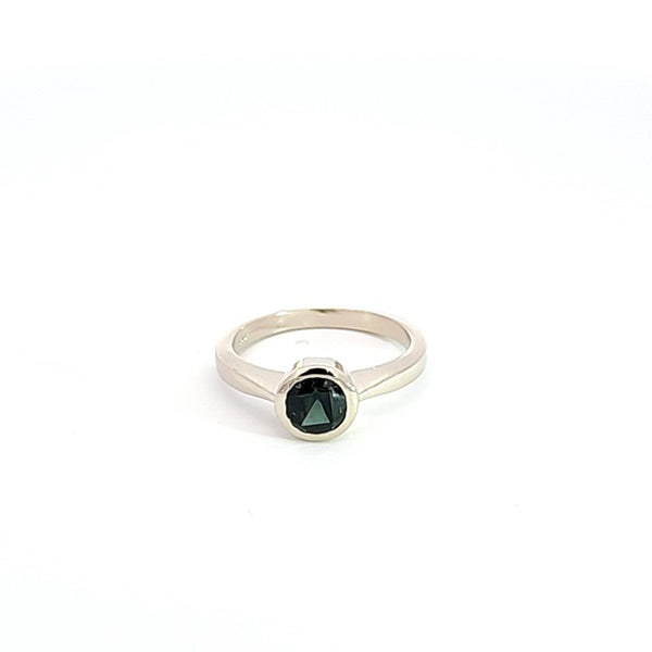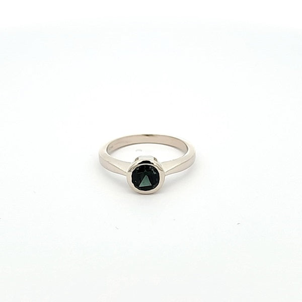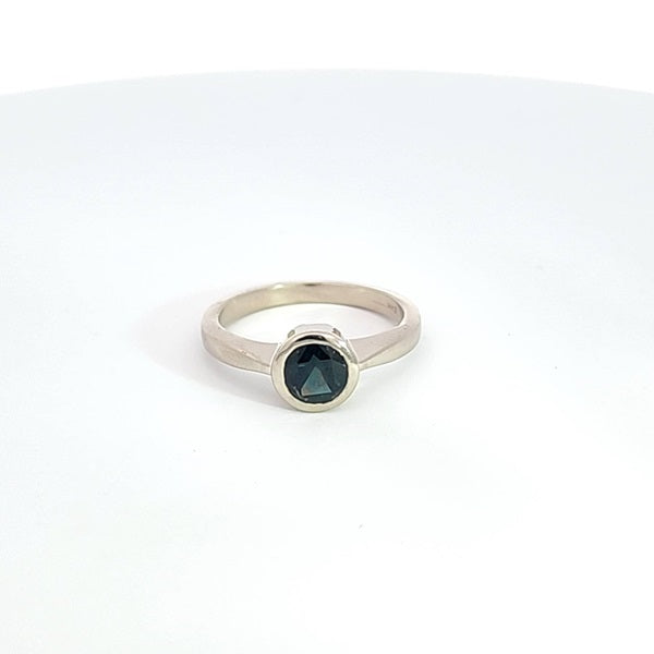 Natural bluish green sapphire bezel set in 14k white gold. Stone is a deep color, hand cut in a unique tabletop faceted cut & set in a heavy bezel on a thick tapered band. Stone is 6.7mm & 1.48ct.