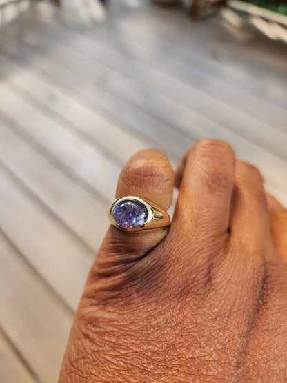Natural mermaid tanzanite from Tanzania set in 14k yellow gold. Stone is purple colored with flecks of teal. Setting made specifically for the stone & casted. Comfortable on the finger.