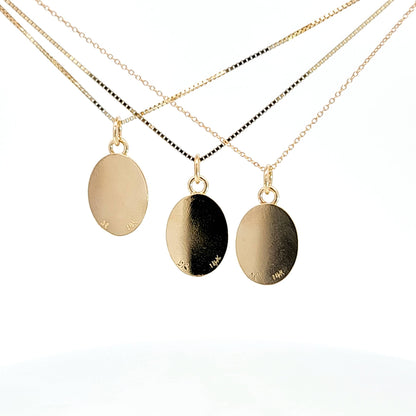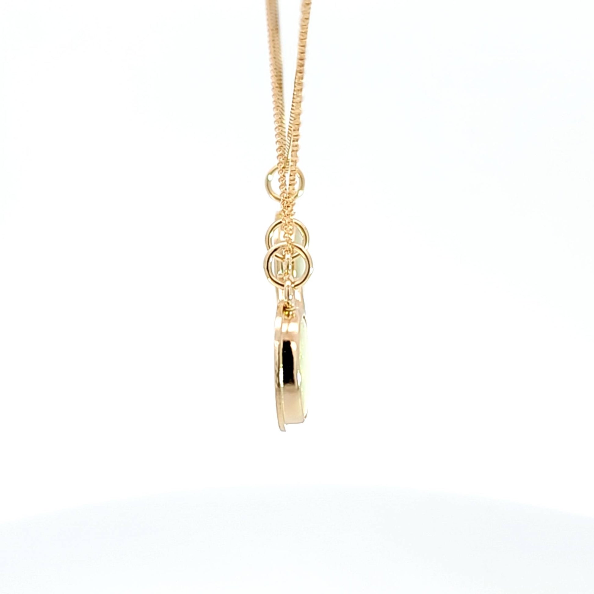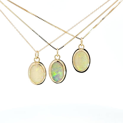 Natural opal from Australia set in 14k yellow gold. Stone is bezel set with backing to protect it. Pieces are signed for metal quality. Pendant only.