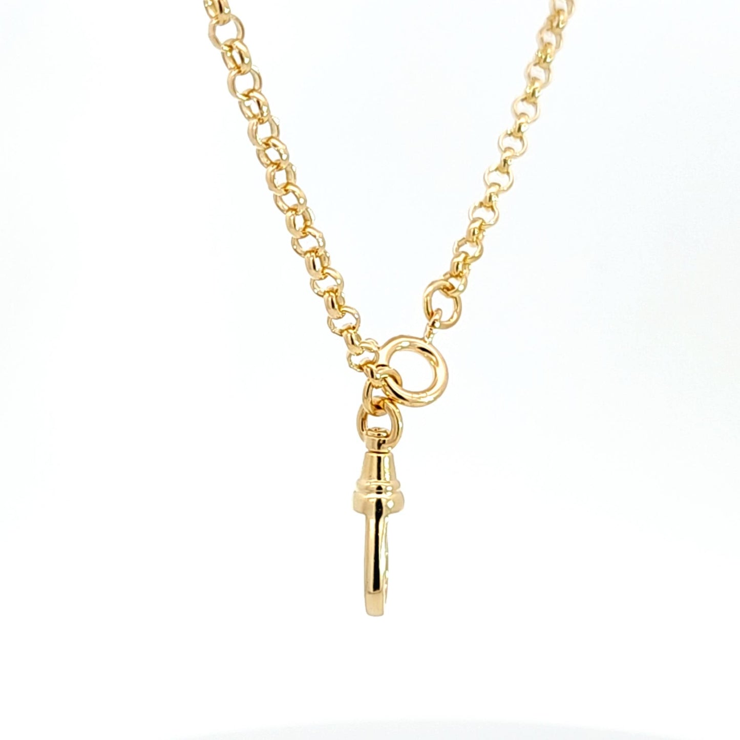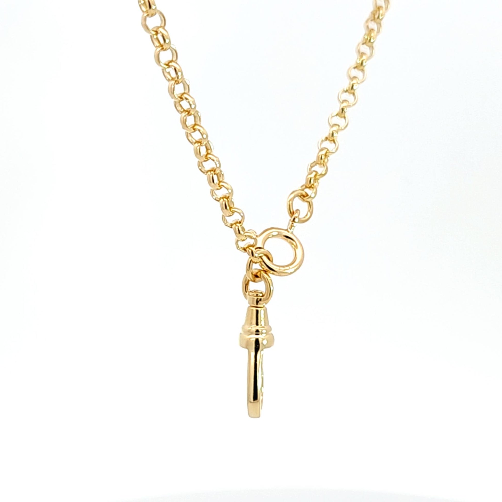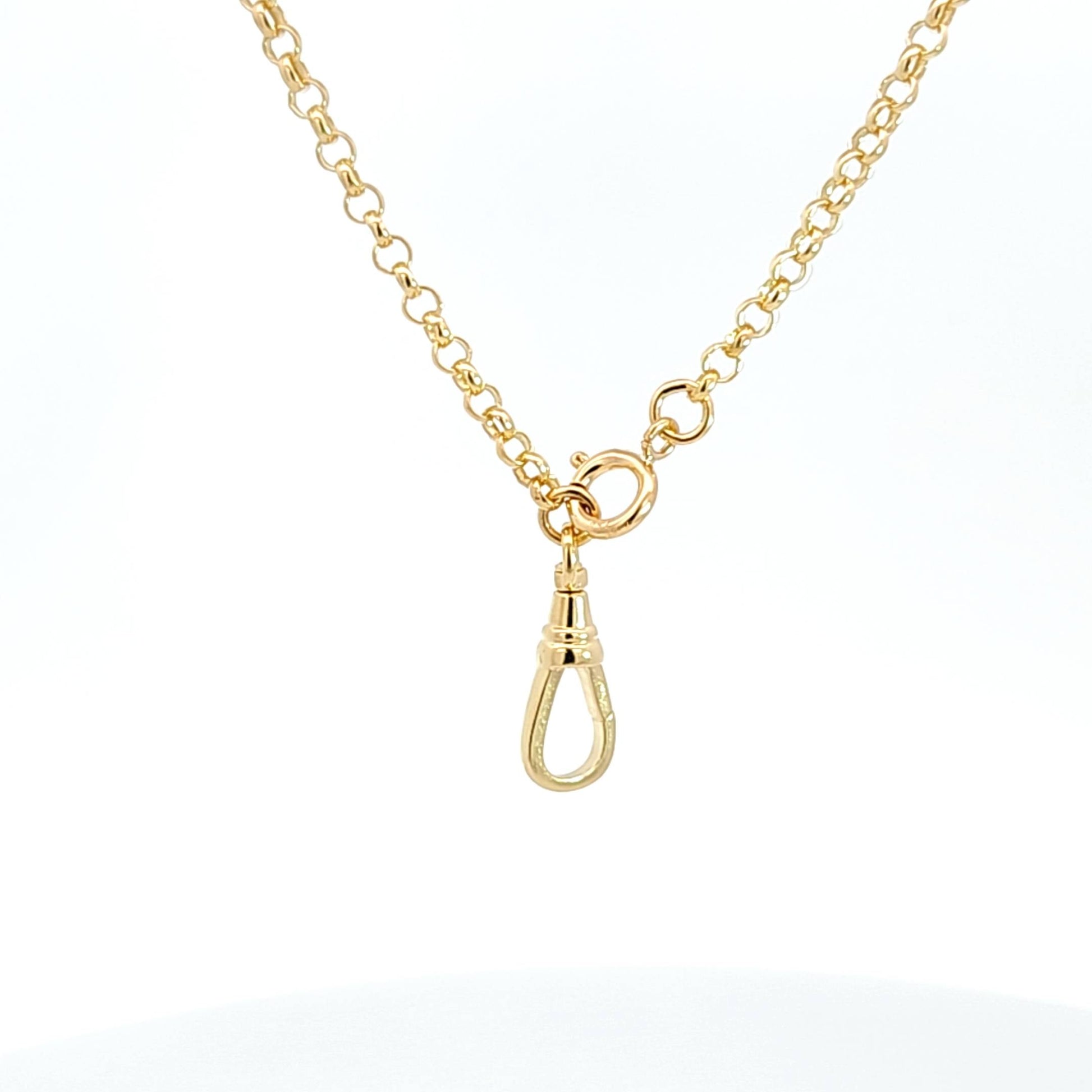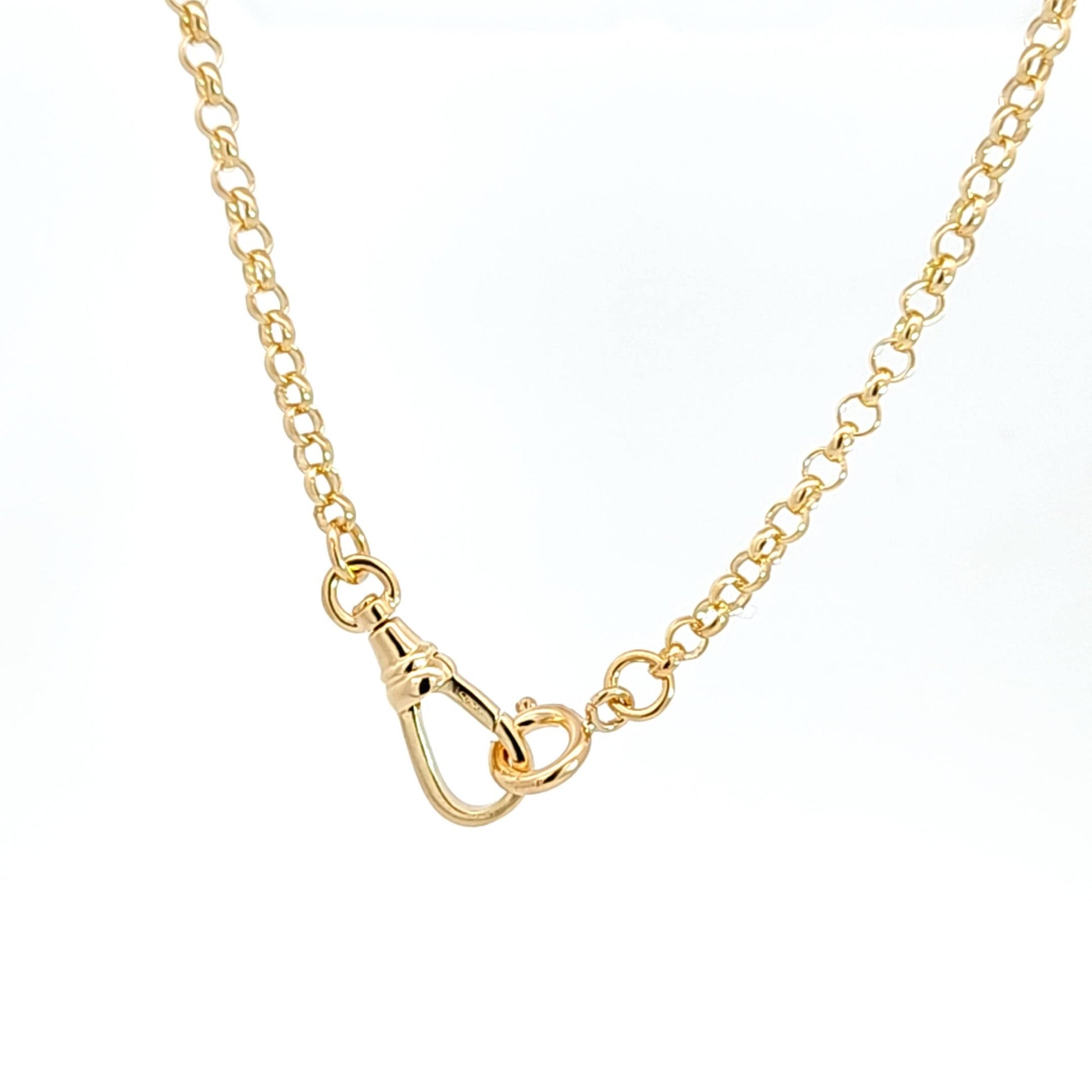 Solid 18k yellow gold 3.4mm rolo (Belcher) chain finished with a large dog clip clasp on one side & a spring ring clasp on the other. Spring ring is 8mm & dog clip clasp is 22mm long. Chain is a solid rolo.