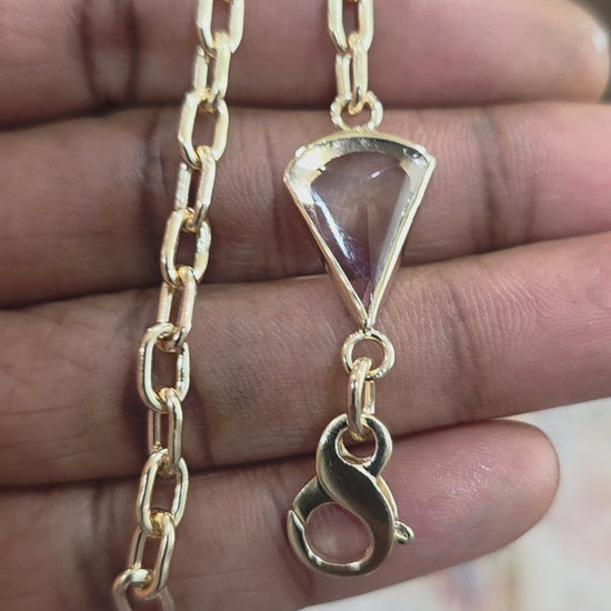 Natural ametrine bezel set in 14k yellow gold. Finished with a handmade cable chain. Chain is made from 1.29mm wire & connected to the gem which is them connected to a large claw clasp. Stone is set with an open back to let light through. Can be worn as a bracelet or used as a chain extender with the clasp working as a charm holder.