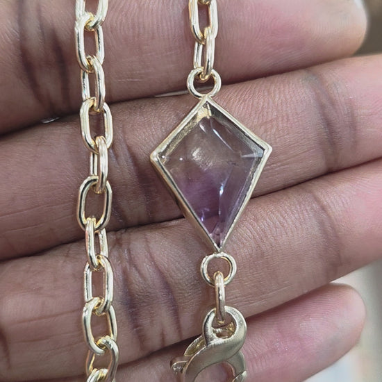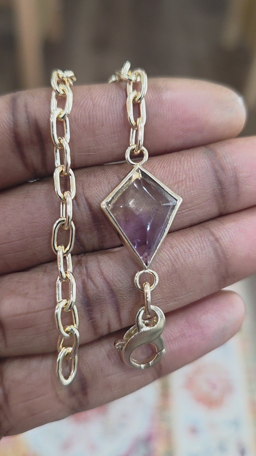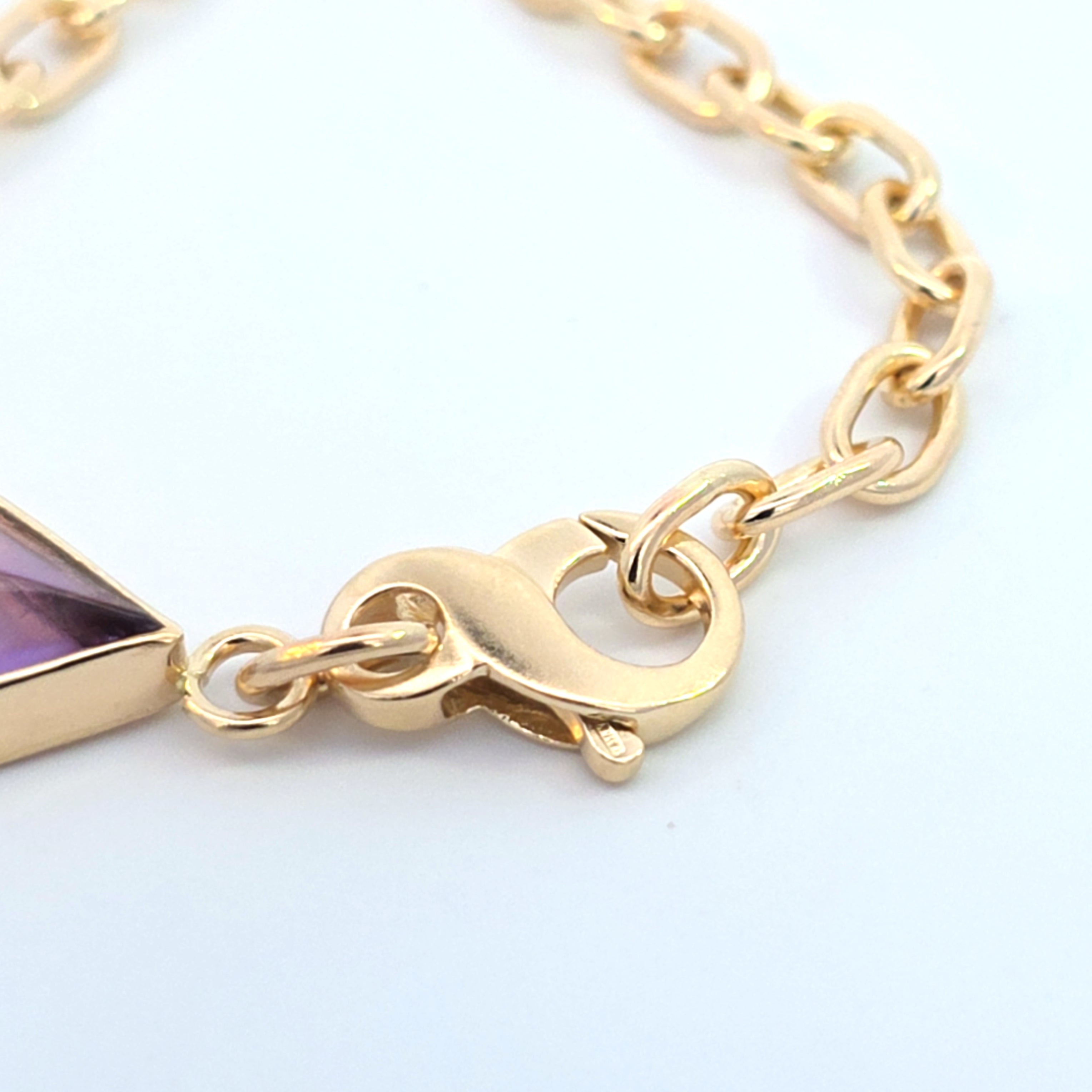 Natural ametrine bezel set in 14k yellow gold. Finished with a handmade cable chain. Chain is made from 1.29mm wire & connected to the gem which is them connected to a large claw clasp. Stone is set with an open back to let light through. Can be worn as a bracelet or used as a chain extender with the clasp working as a charm holder.