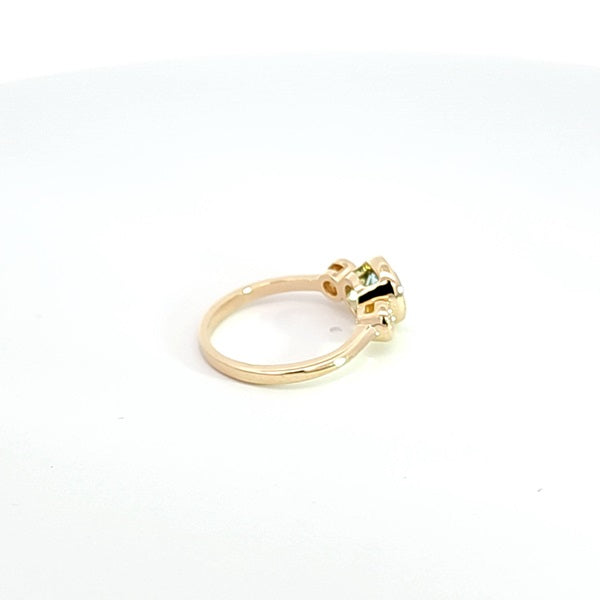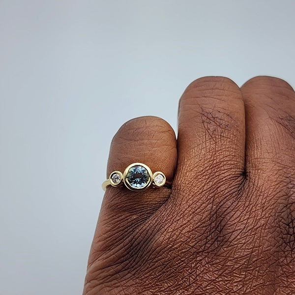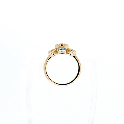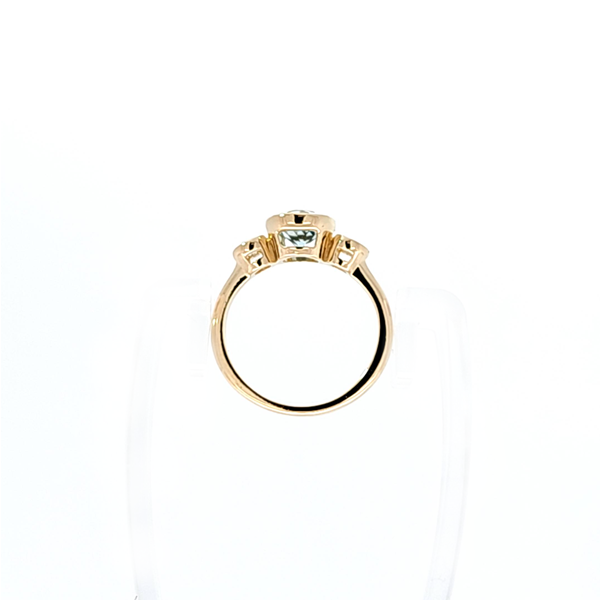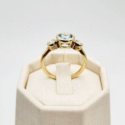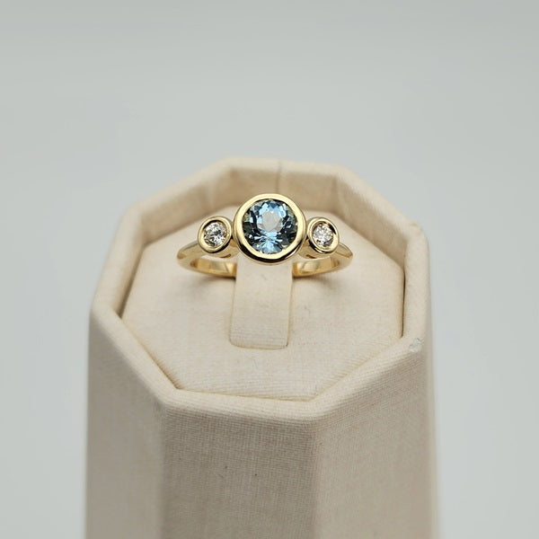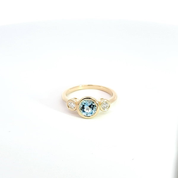 Natural aquamarine bezel set in 14k yellow gold with 2 diamonds as side stones. Cut outs on sides of bezel to allow light through the stones. Aquamarine is 6.5mm sized & diamonds are 3mm each. Both diamonds are SI1 clarity.