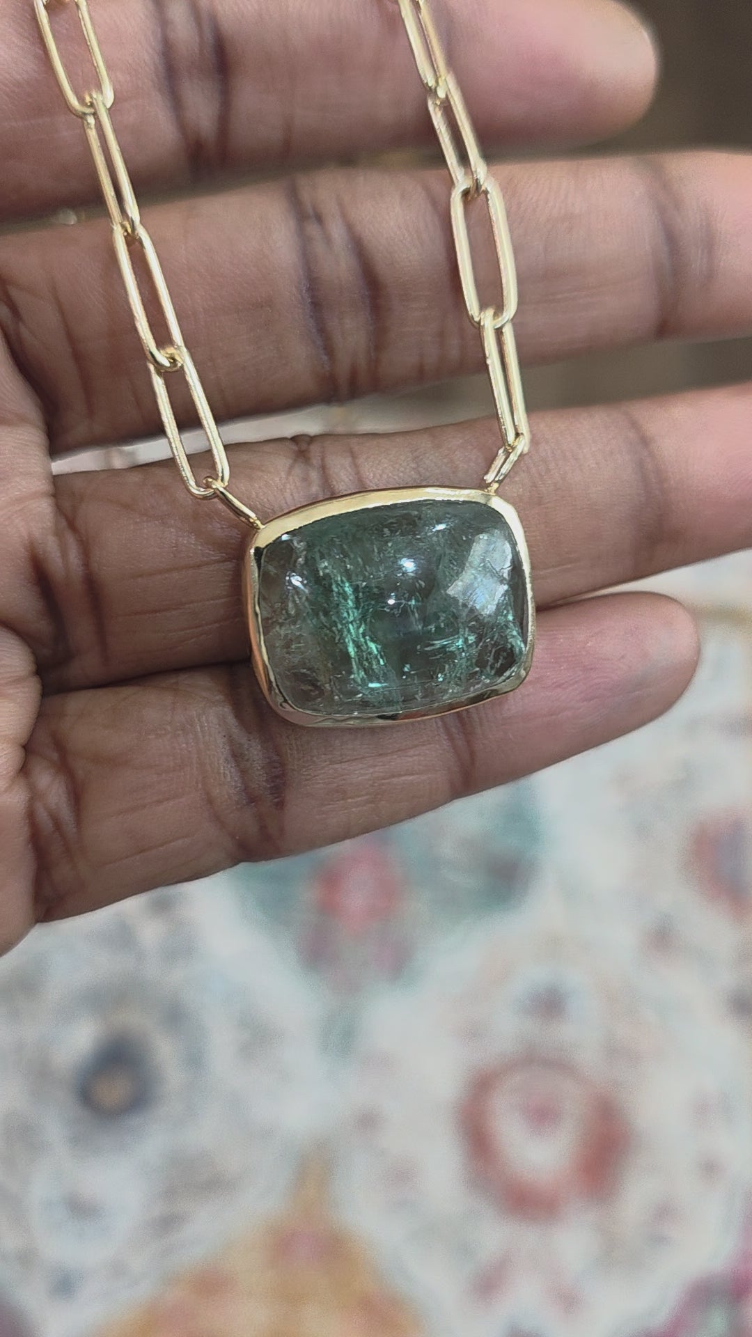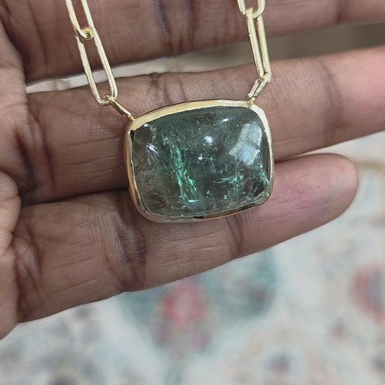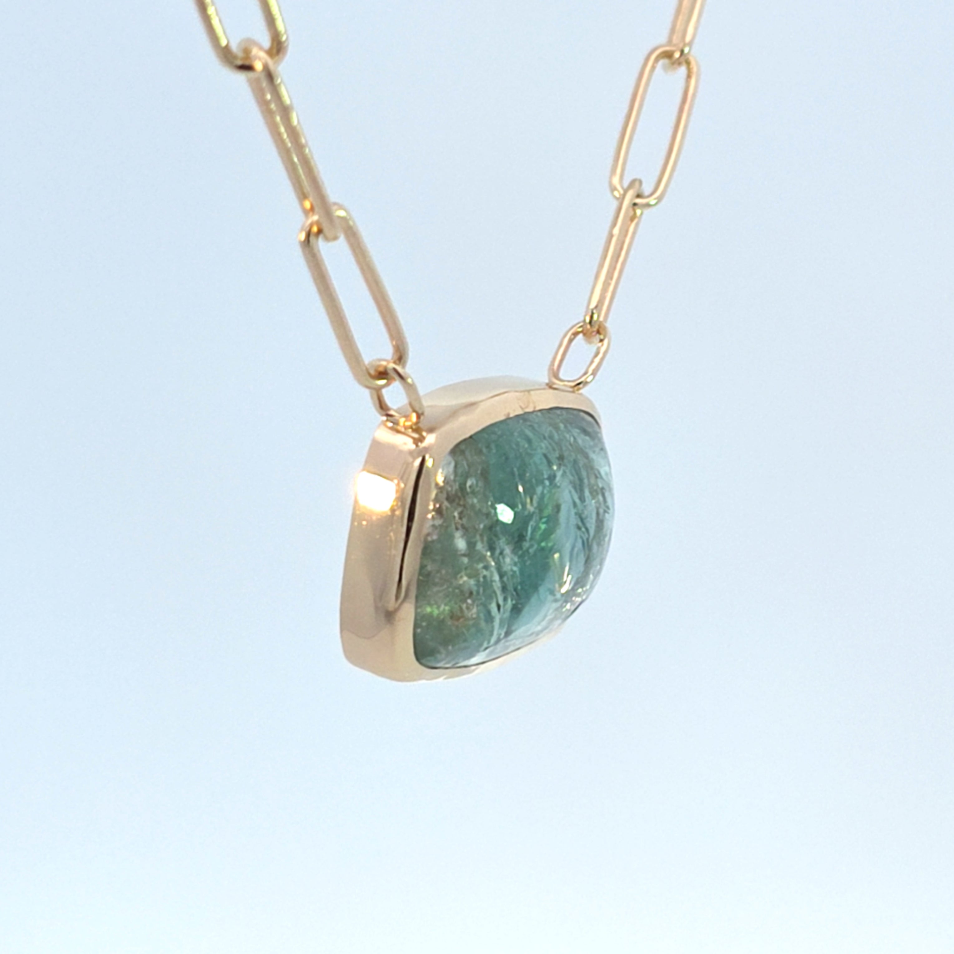 Natural blue tourmaline with a touch of pink. Smooth cabochon cut stone bezel set in 14k yellow gold. Finished with a handmade paperclip chain. Elongated push clasp to create a seamless look. Stone is set with an open back to let light through.