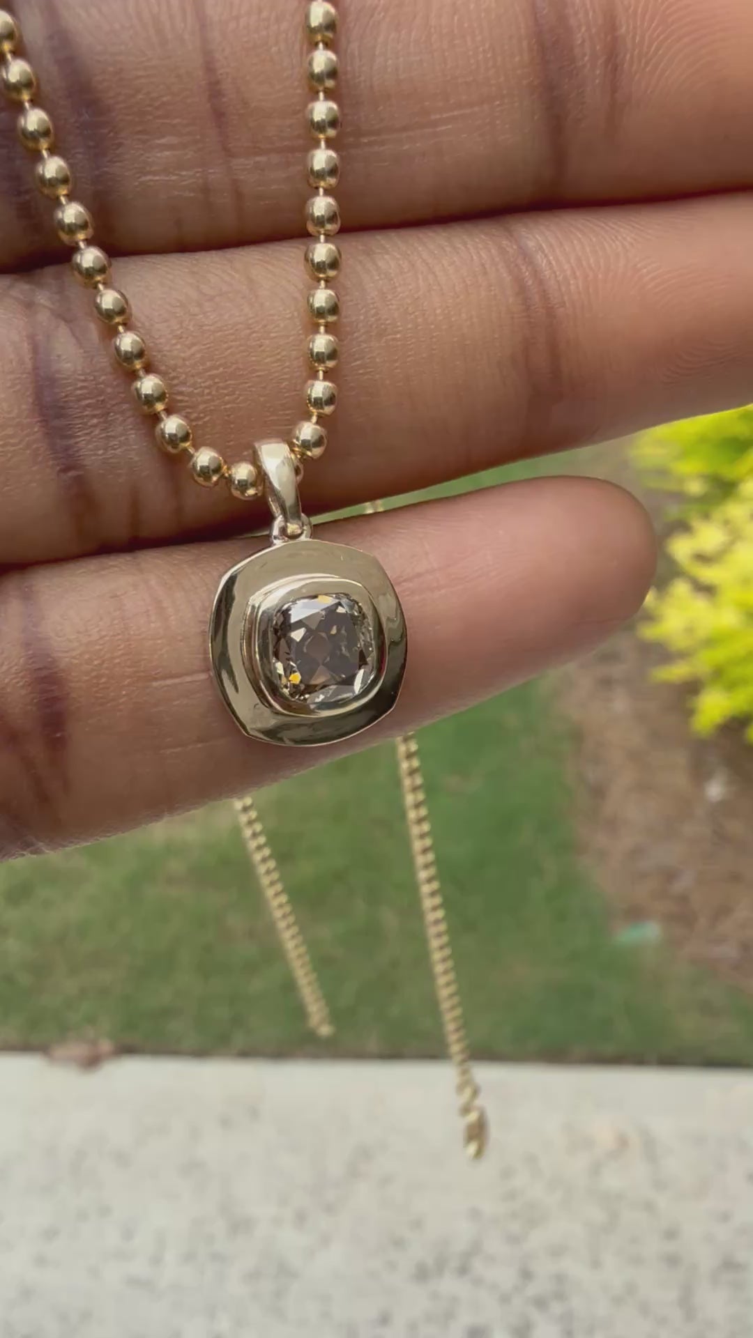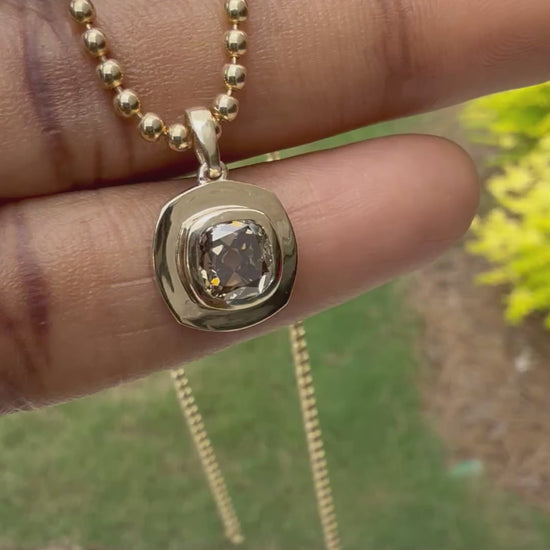 Natural cushion cut brown diamond set in 14k yellow gold. Stone has a heavy bezel setting on a surface that fans out. Stone size is 6mm & weighs 1.49ct. Pendant is smooth & polished to a high shine glossy finish.