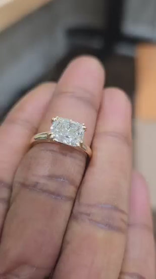 Lab created diamond (VS, FG color) solitaire ring. Double prong setting in a raised cathedral style shank with 2x 1.5mm natural flush set diamonds. Thick half round band. Stone is set high so it can be stacked with regular bands.