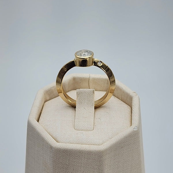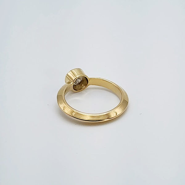Natural grey-ish white diamond with salt & pepper inclusions bezel set in 14k yellow gold on a thick knife edge band. Band is 3mm wide by 2.5mm thick & is flush set with 2x 2mm VS clarity white diamonds, 1 on either side.