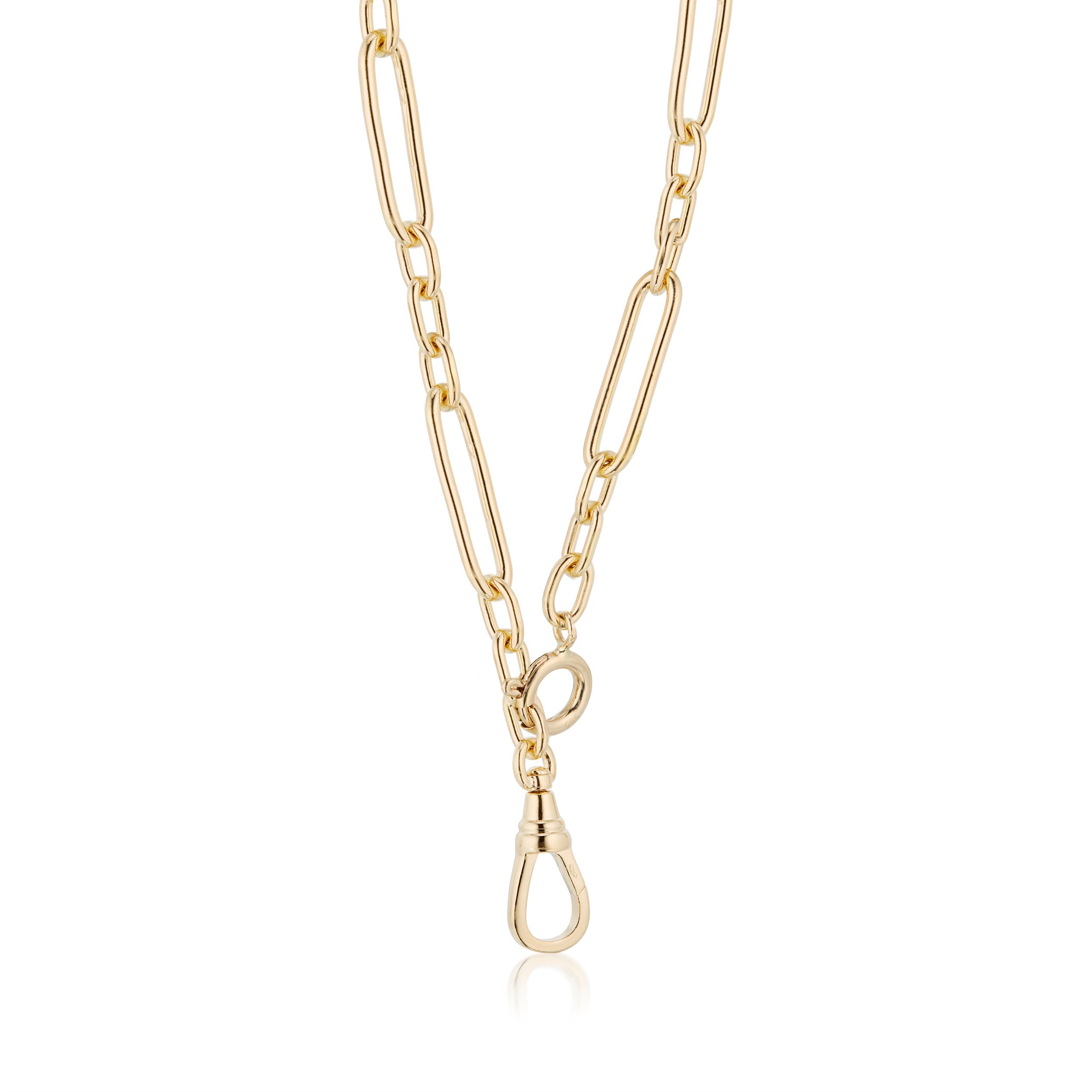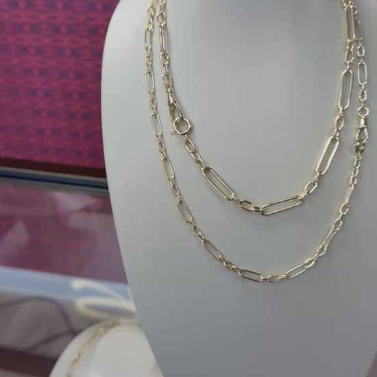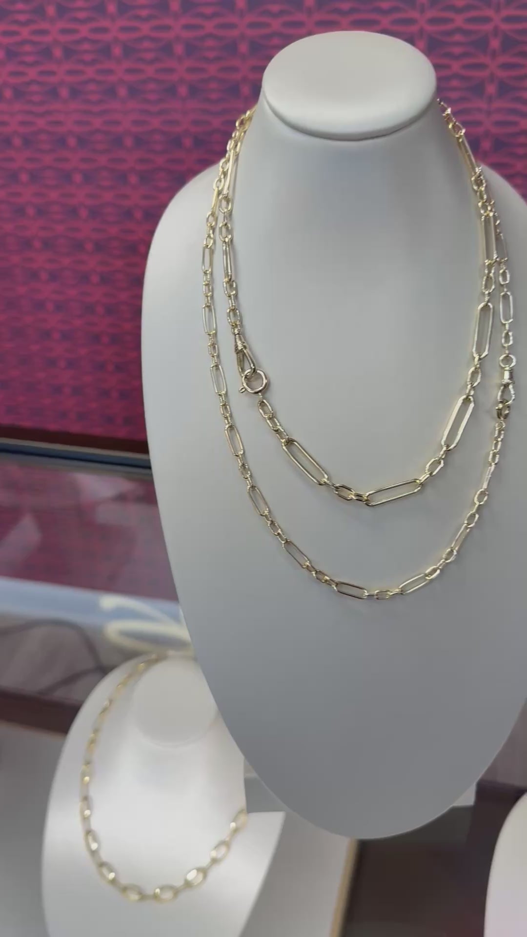 From the first link to the last, this handcrafted trombone chain is a nod to vintage style. Carefully crafted from solid (not hollow) 1.63 & 1.29mm wire, every link is individually formed, connected, and soldered to create a striking yet durable design. The chain features two distinct, prefabricated clasps: a sleek spring ring clasp on one end and a bold dog clip clasp on the other for endless versatility. The 14k chain is finished with a round spring ring clasp, while the 18k has a flat spring ring clasp. Attach your most-loved pendants for a personalized twist or keep the clasps out of sight for a refined collar effect