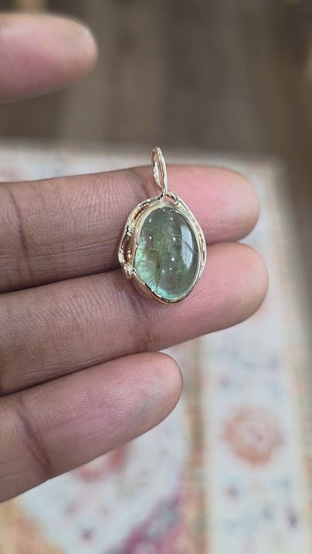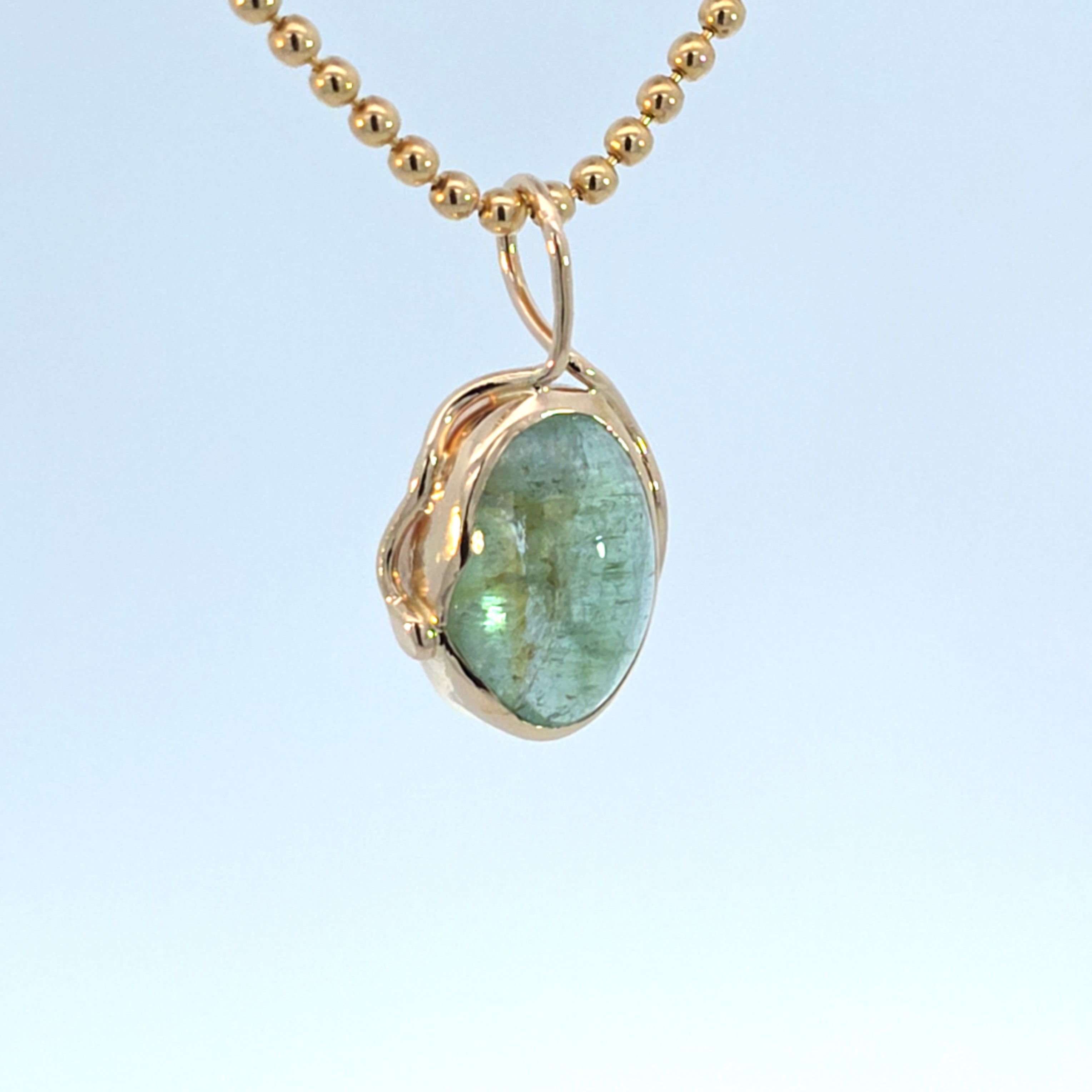 Natural tourmaline set in 14k yellow gold. Finished with a wrapped snake bail, stone bezel set with an open back to let light through. Piece is marked with metal karat.