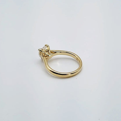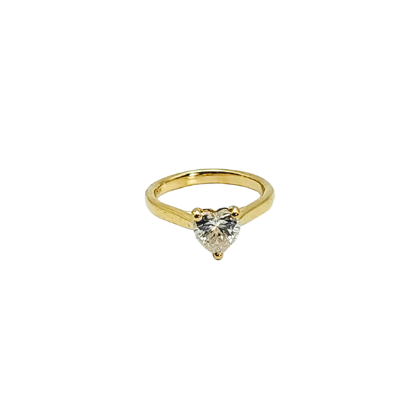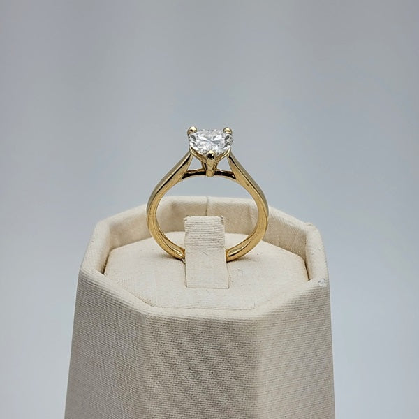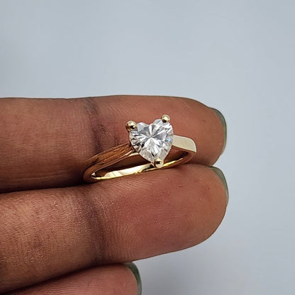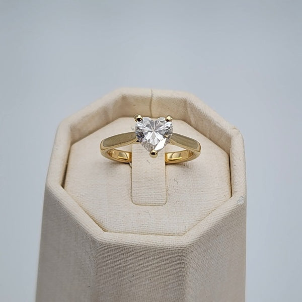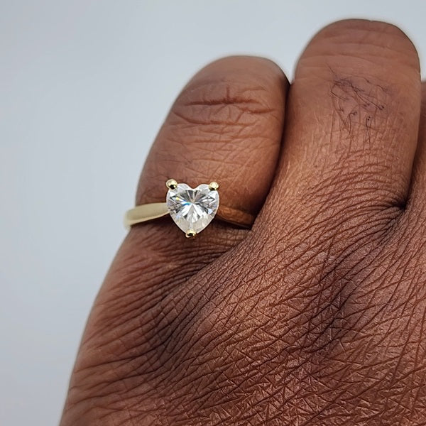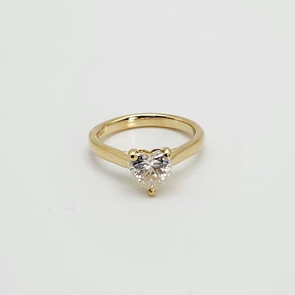7mm sized lab grown moissanite heart prong set in 14k yellow gold. Double gallery setting, cathedral shank. 3 prongs. Will make a great engagement ring.