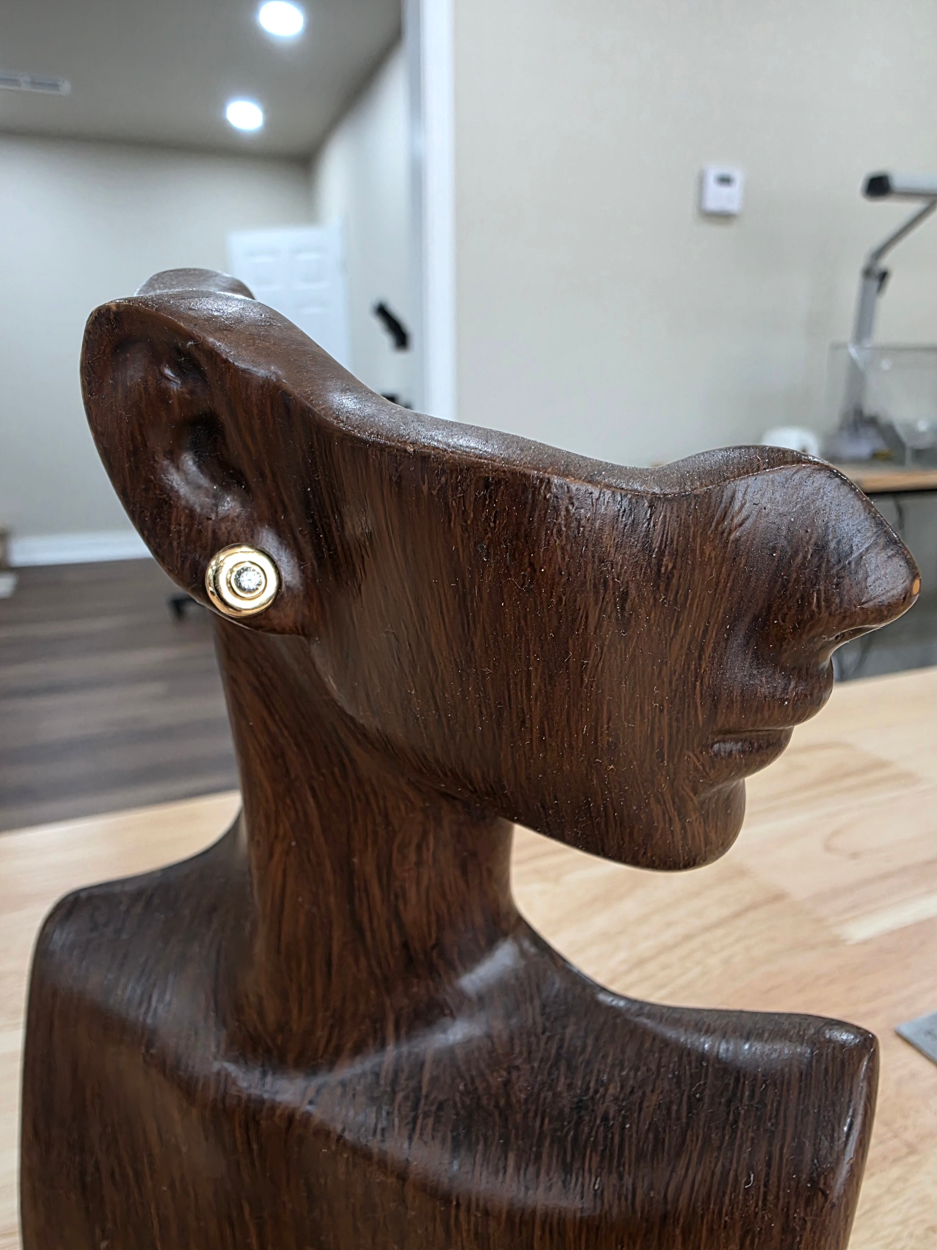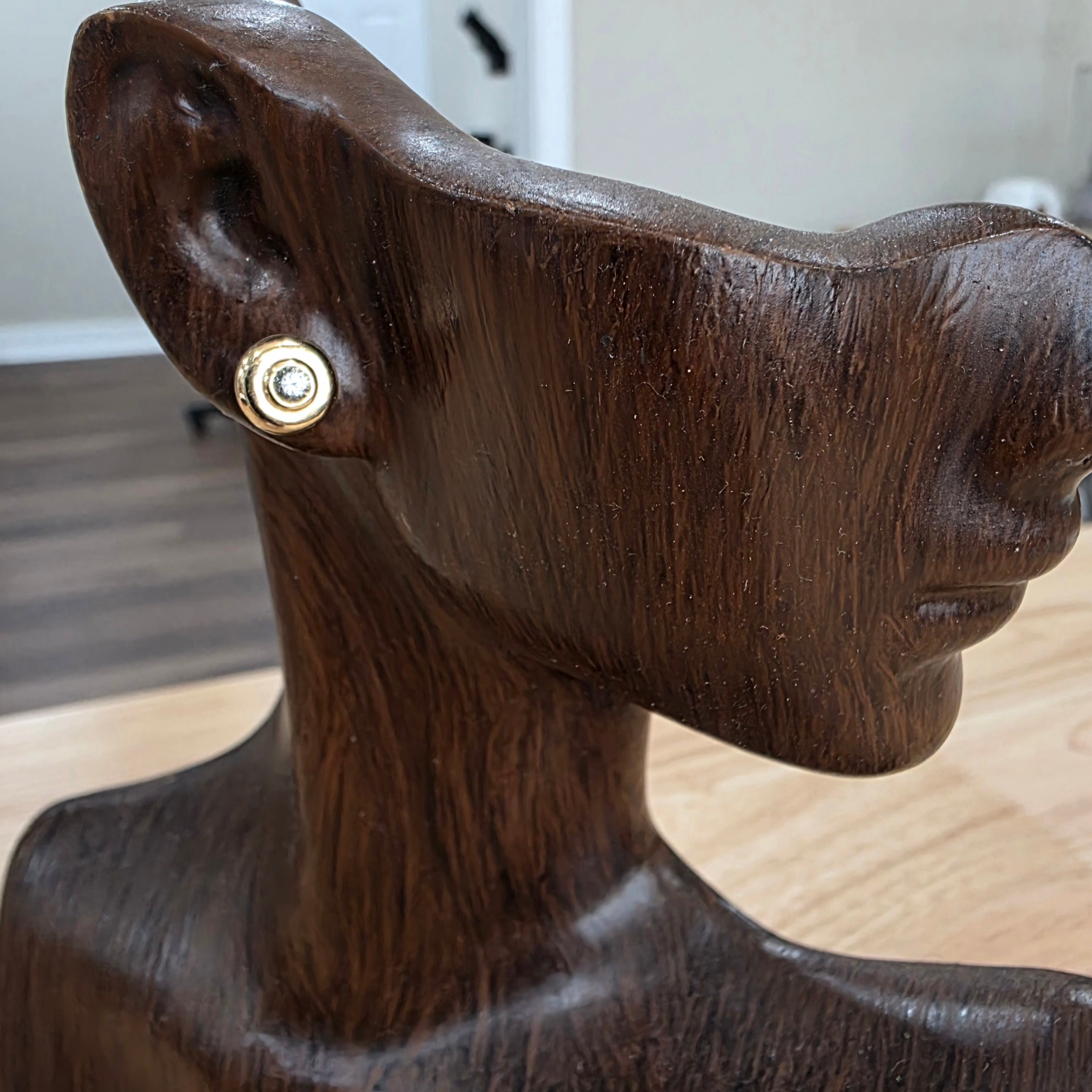 Natural light green unheated Montana sapphire set in 14k yellow gold. Bezel setting with s slight dome. Solid with no opening. Closed back. Finished with posts & silicon covered 14k gold earring backs.