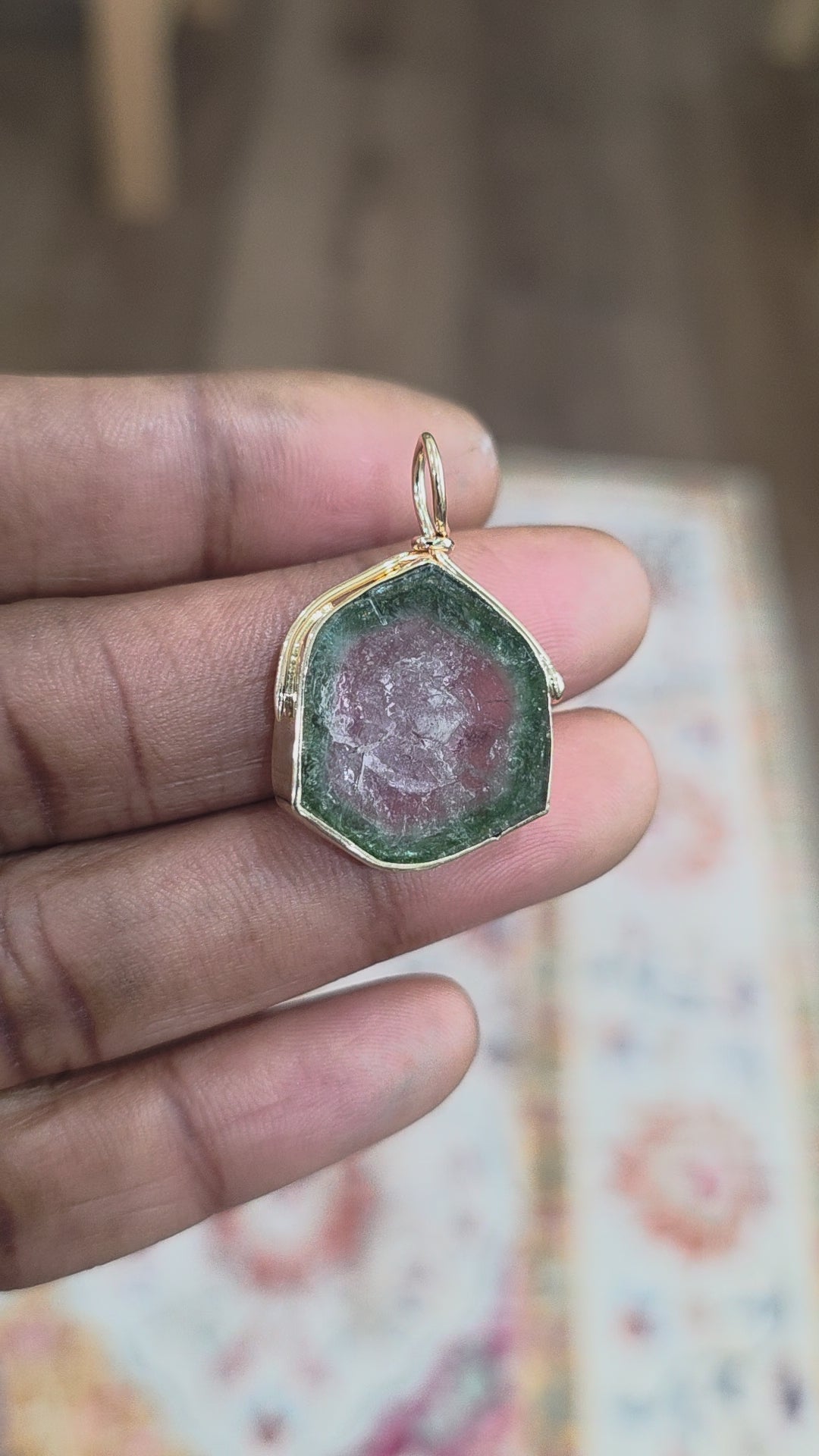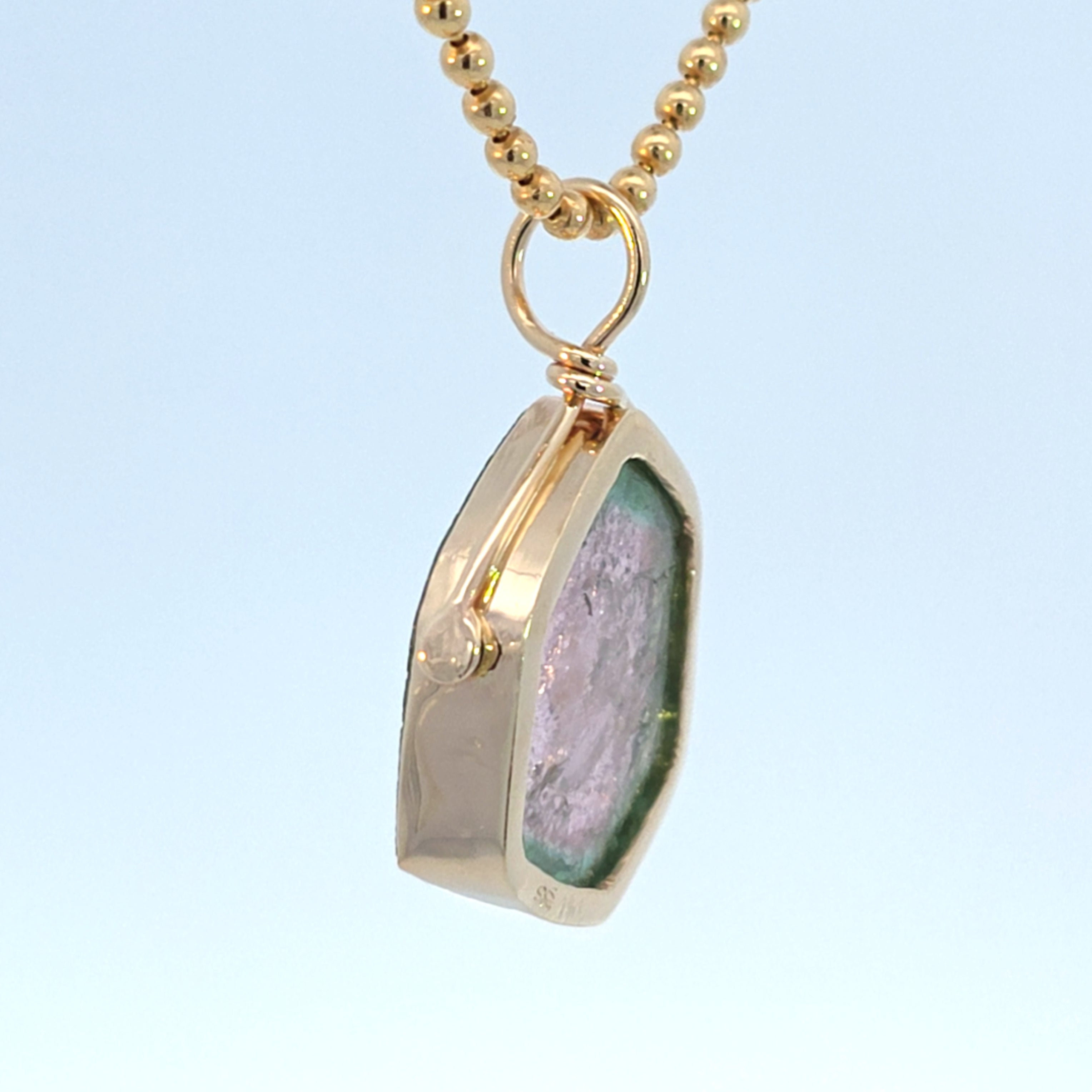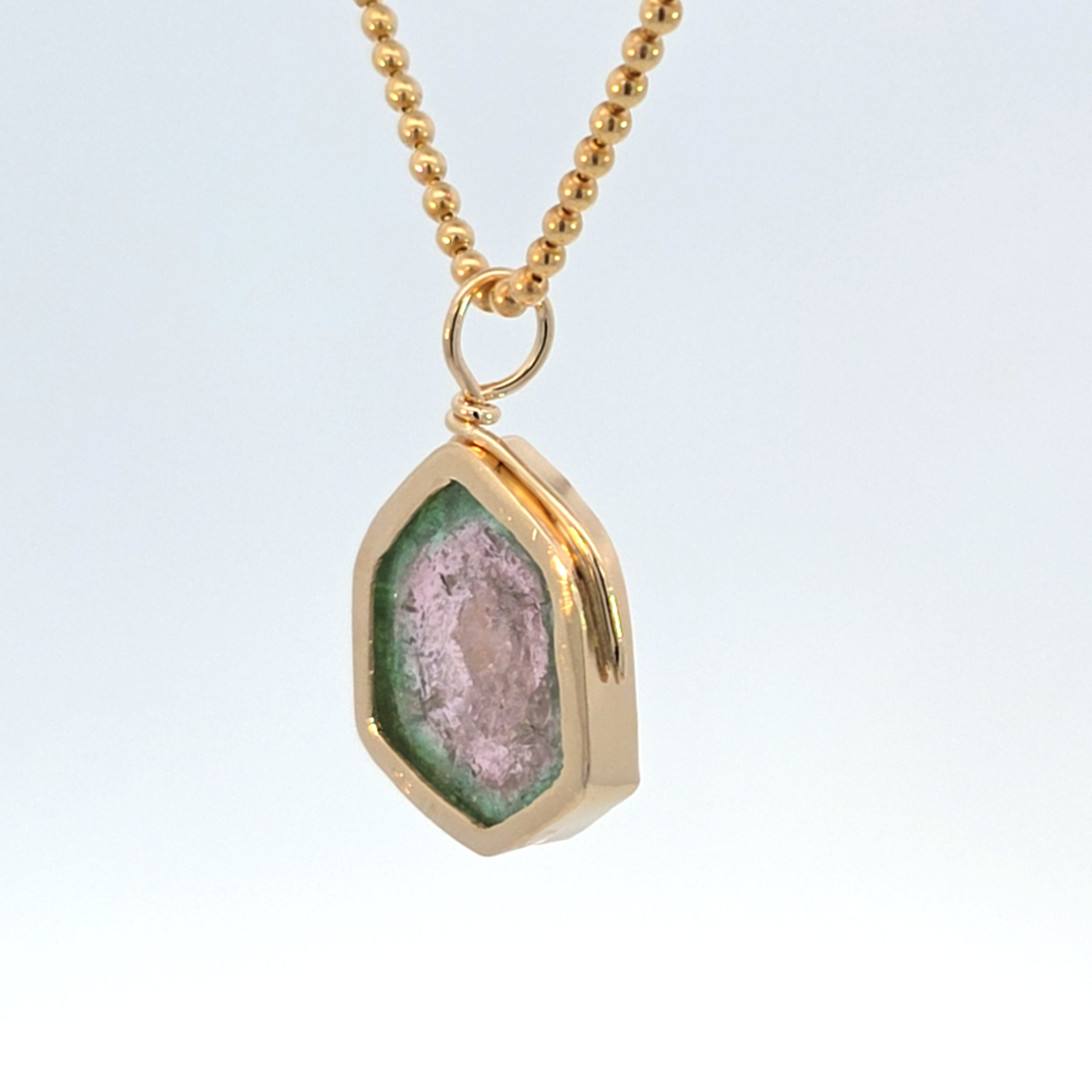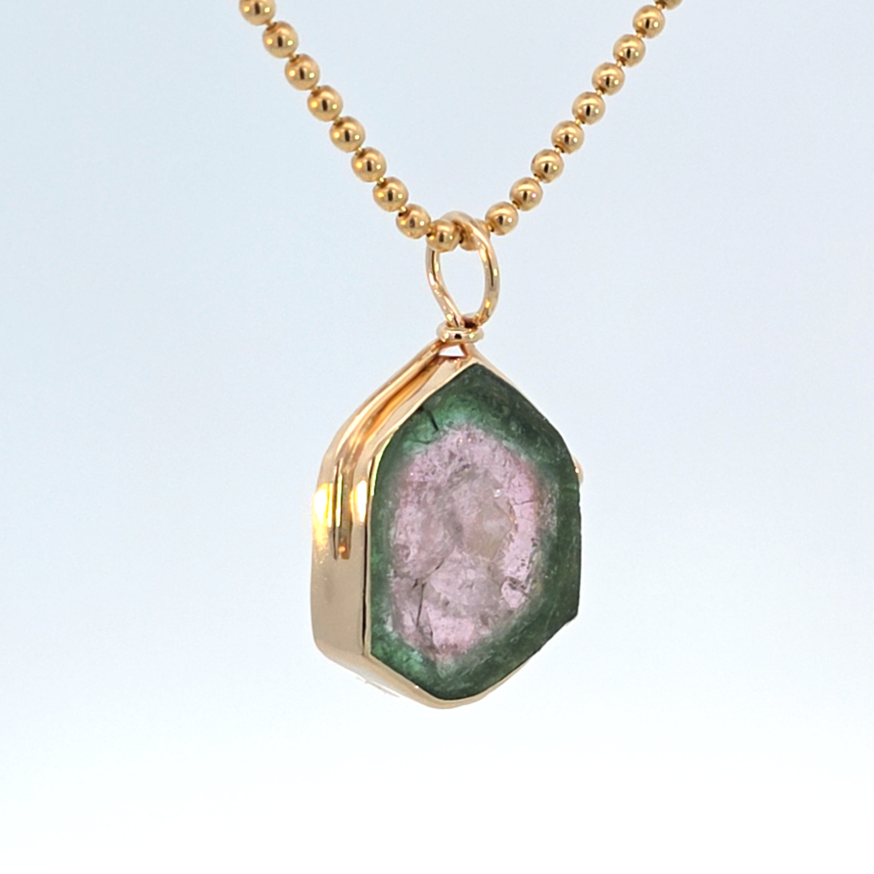 Natural tourmaline set in 14k yellow gold. Stone is deep green around the edge, pink in the center & bezel set with an open back to let light through. Piece is marked with metal karat.