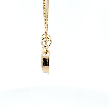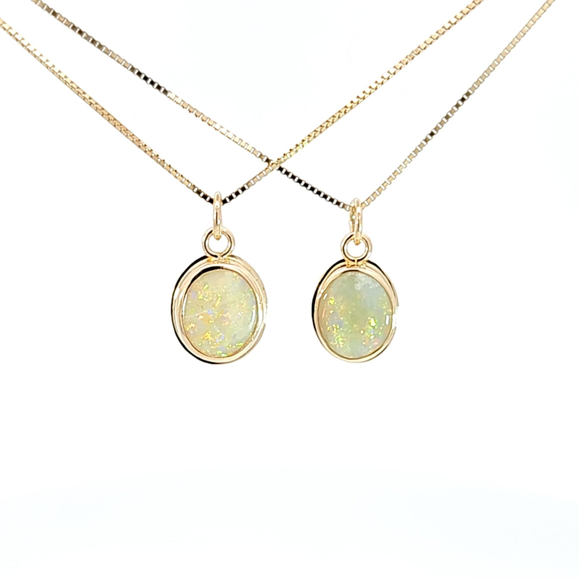 Natural opal from Australia set in 14k yellow gold. Stone is bezel set with backing to protect it. Pieces are signed for metal quality. Pendant only.